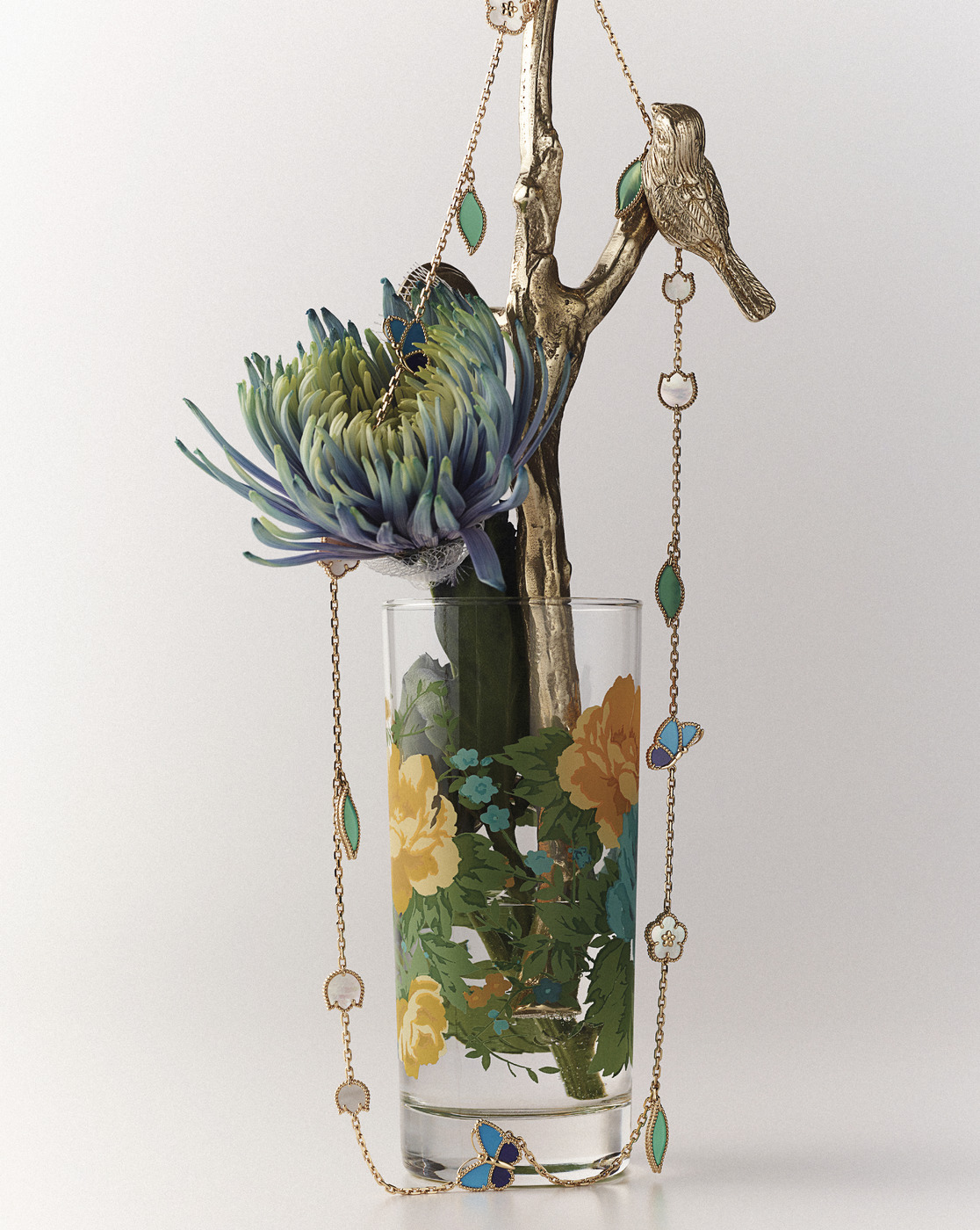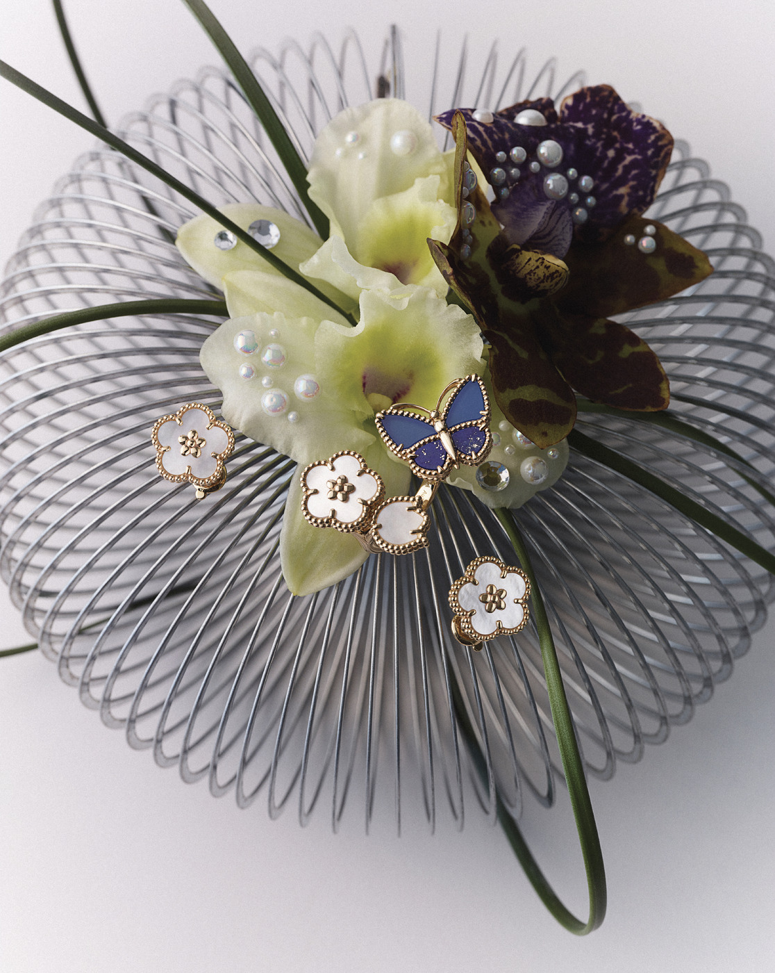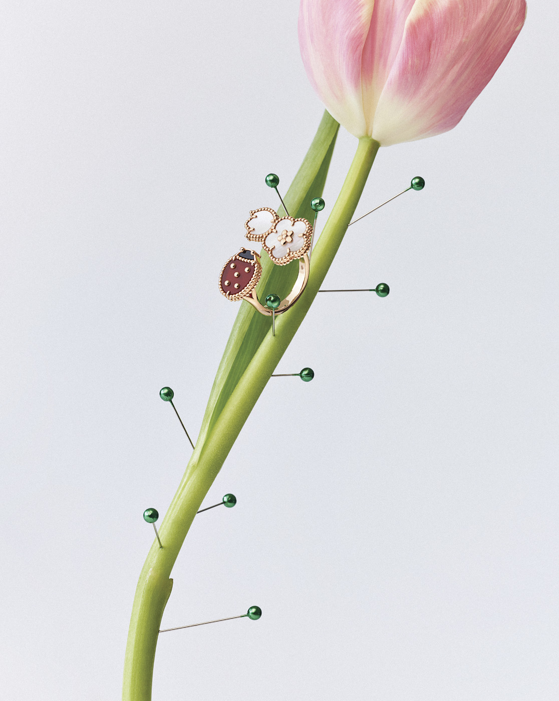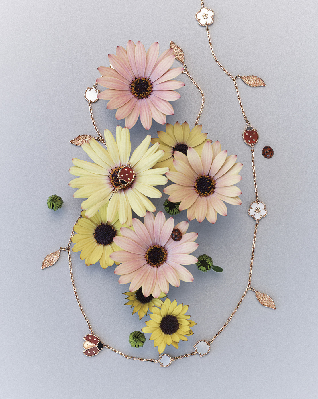 FULL BLOOM 흰색 자개로 완성한 매화꽃과 은방울꽃 봉오리, 로즈 골드 잎사귀, 메종의 또 다른 아이콘인 무당벌레 등 총 15개 모티브로 이루어진 ‘럭키 스프링’ 롱 네크리스. 행운을 상징하는 무당벌레는 카넬리안과 오닉스로 완성했다.