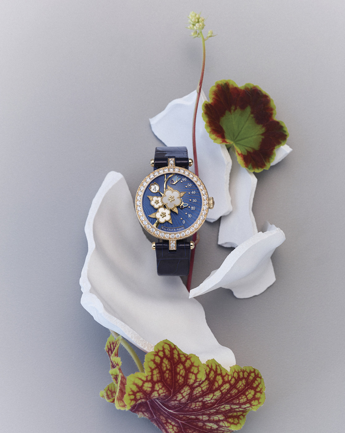 FLIGHT TIME 새롭게 선보이는 포에틱 컴플리케이션 시계 ‘레이디 럭키 스프링 버터플라이’가 자연이 깨어나는 순간을 기념한다. 푸른빛으로 물든 기요셰 자개 다이얼 위로 매화꽃 세 송이를 입체적으로 배치했으며, 골드 비즈로 둘러싸인 은방울꽃 봉오리 형태의 창이 시간을 표시한다. 레트로그레이드 미닛 및 점핑 아워 기능을 갖춘 셀프와인딩 메커니컬 무브먼트 덕분에 날개를 펼친 나비가 우아하게 움직이며 분을 나타낸다.