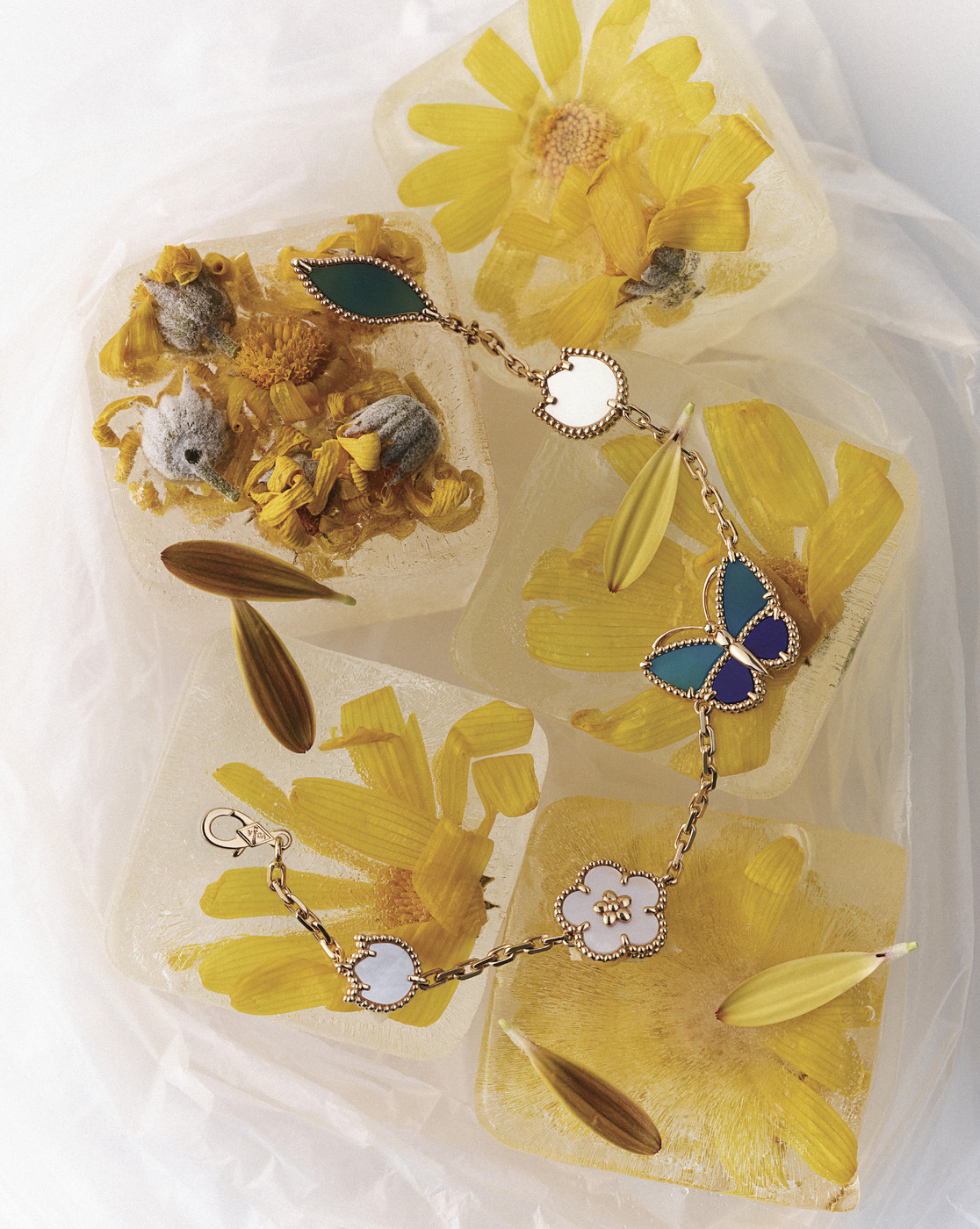FROZEN YELLOW 총 5개 모티브로 이루어진 ‘럭키 스프링 버터플라이’ 팔찌. 상징적인 더블 비즈가 감싸고 있는 각 모티브의 아주 작은 디테일까지 앞뒷면이 동일해 착용 시 뒤집혀도 문제없다.