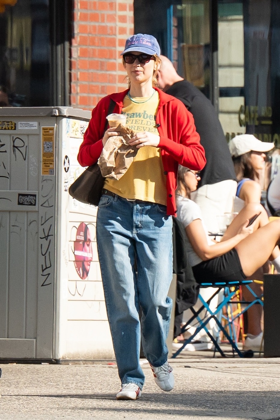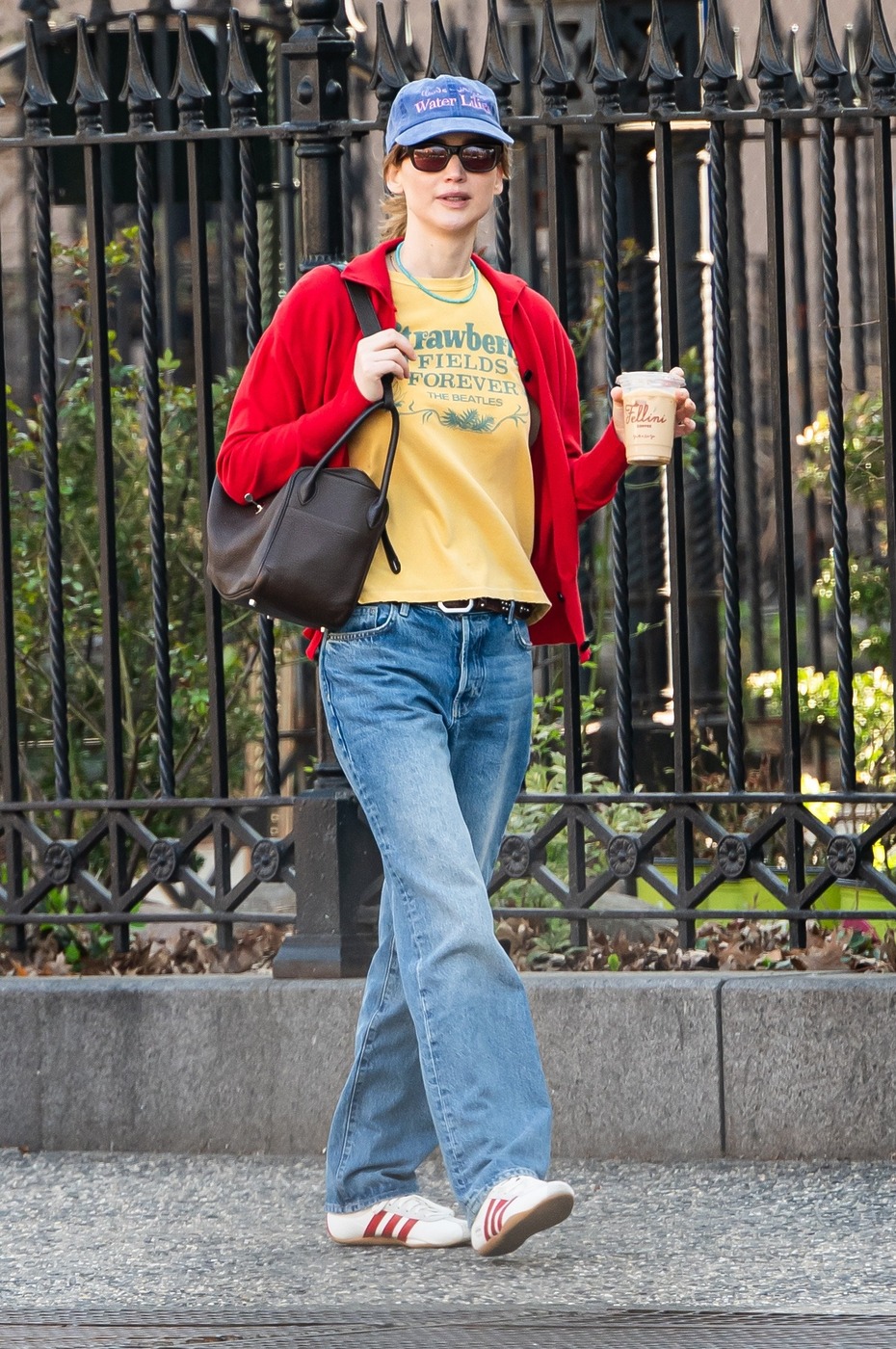 제니퍼 로렌스가 선택한 색 조합은 ‘레드와 옐로’였습니다. 스트레이트 핏 데님에 물이 살짝 빠진 노란 티셔츠를 매치한 뒤, 새빨간 카디건을 걸치며 룩을 마무리했죠. 밝은색을 겹쳐 입은 탓에 지나치게 화려해 보일 수 있는 룩이었지만, ‘클래식 중의 클래식’인 연청 데님이 중심을 잡아준 덕분에 지극히 현실적으로 느껴졌습니다. 슈즈와 백 역시 눈에 들어왔는데요. 제니퍼 로렌스가 레드가 살짝 첨가된 스니커즈가 아니라 새빨간 신발을 신었다고 상상해보세요. 분명 ‘투 머치’로 느껴졌을 겁니다. 상의로 마음껏 멋을 부린 만큼 백은 차분한 색으로 골랐군요.