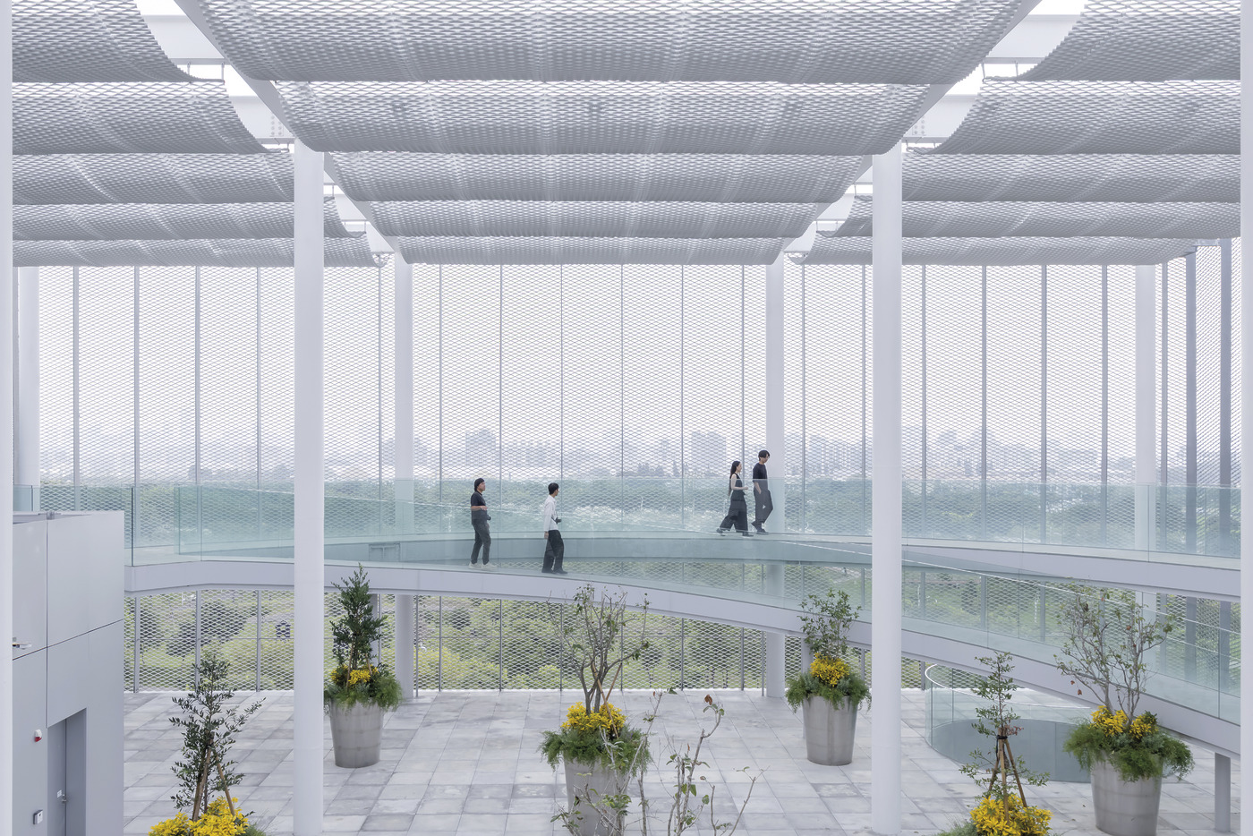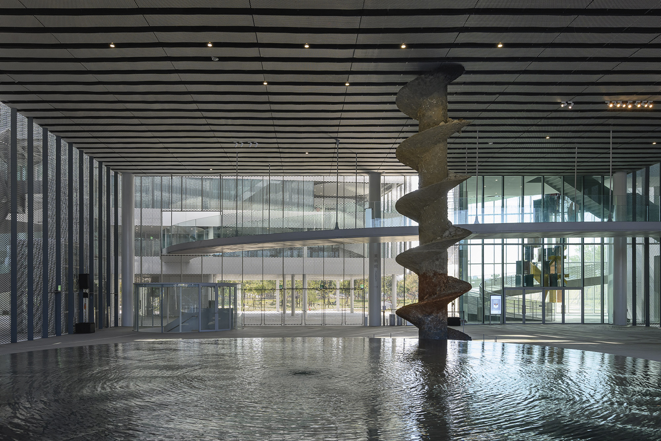 1층은 중정처럼 뚫려 있고 대형 인공 연못이 있다. 대만의 열기가 빠지도록 바람이 통하는 구조로 시민이면 누구나 들어와 쉴 수 있는 그늘막을 자처한다. 실내는 사나의 건축 언어인 유동성과 무경계성을 담고 있다. 8동의 구조물은 교량으로 이어져 걷다 보면 전시장과 도서관을 자연스럽게 오간다. 벽은 투명한 유리와 창이 대신하고, 각 층이 헷갈릴 만큼 경계가 모호하며, 입구도 많아 여러 방향에서 안으로 진입할 수 있다.