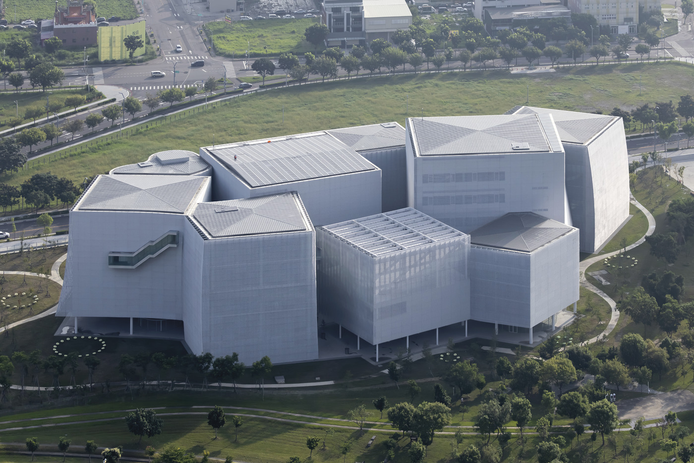 그린 뮤지엄브러리는 그야말로 녹지 한가운데 자리한다. 슈이난 무역경제 생태공원에 속하는 중앙공원은 군용 비행장 부지였던 과거는 찾아볼 수 없다. 순백의 건물 8동은 5만8,000㎡의 규모인데도 튀지 않고 주변과 어우러진다. 2010년 프리츠커상, 2025년 영국 왕립건축가협회에서 로열 금메달을 수상한 일본의 세계적인 건축 사무소 사나(SANAA)가 설계와 디자인을 맡았다. 사나의 세지마 가즈요(Sejima Kazuyo)와 니시자와 류에(Nishizawa Ryue)는 타이중 시립미술관과 시립도서관을 한데 묶은 이곳에서 ‘예술, 독서, 자연의 공생’을 재현하고자 했다.