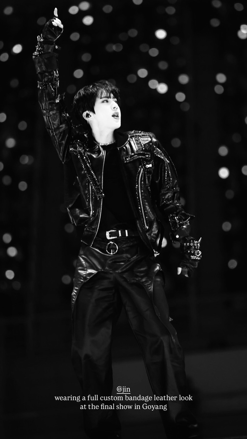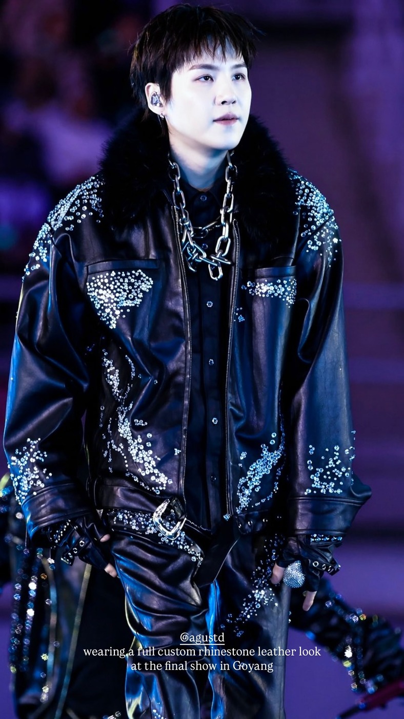 정국은 스포티한 봄버 재킷 전체에 실버 스터드와 장식을 가미한 의상을 입고, 체인 액세서리로 무게감을 더했습니다. 슈가는 라인스톤을 흩뿌린 듯한 가죽 재킷에 굵은 체인 목걸이를 레이어링해 화려한 무대의상을 완성했죠. 진은 몸을 감싸는 듯한 밴디지 디테일과 촘촘하게 박힌 스터드 라인이 특징인 재킷으로 강렬한 실루엣을 완성했습니다.
