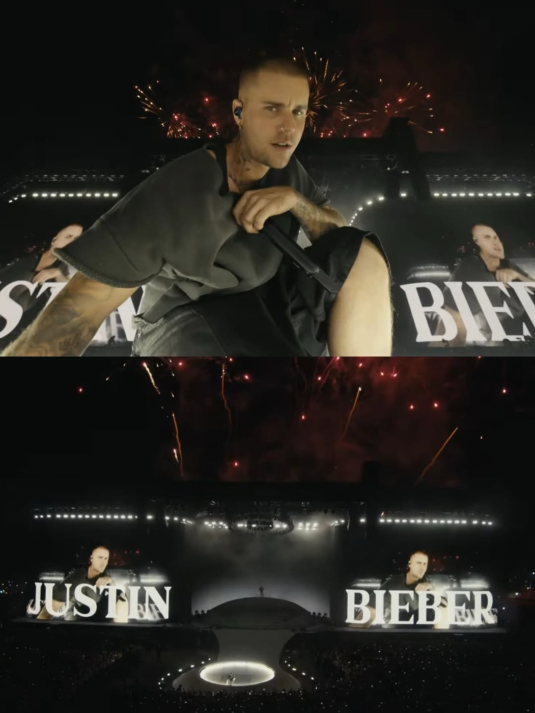 비버는 대형 스크린을 배경으로, 노트북 영상을 틀면서 자신과 관련된 밈을 보여주거나 예전 뮤직비디오를 틀고 공연을 펼쳤습니다. 특히 2008년 그가 부른 ‘With You’ 커버 영상을 틀고 현장에서 노래해 향수를 불러일으켰습니다. 그가 어셔와 스쿠터 브라운에게 발탁되게 만든 바로 그 곡이죠. 이 곡 외에도 ‘Never Say Never’, ‘That Should Be Me’, ‘Baby’, ‘Favorite Girl’, ‘Beauty and a Beat’ 등 자신의 히트곡을 직접 연주하며 노래를 불렀습니다.