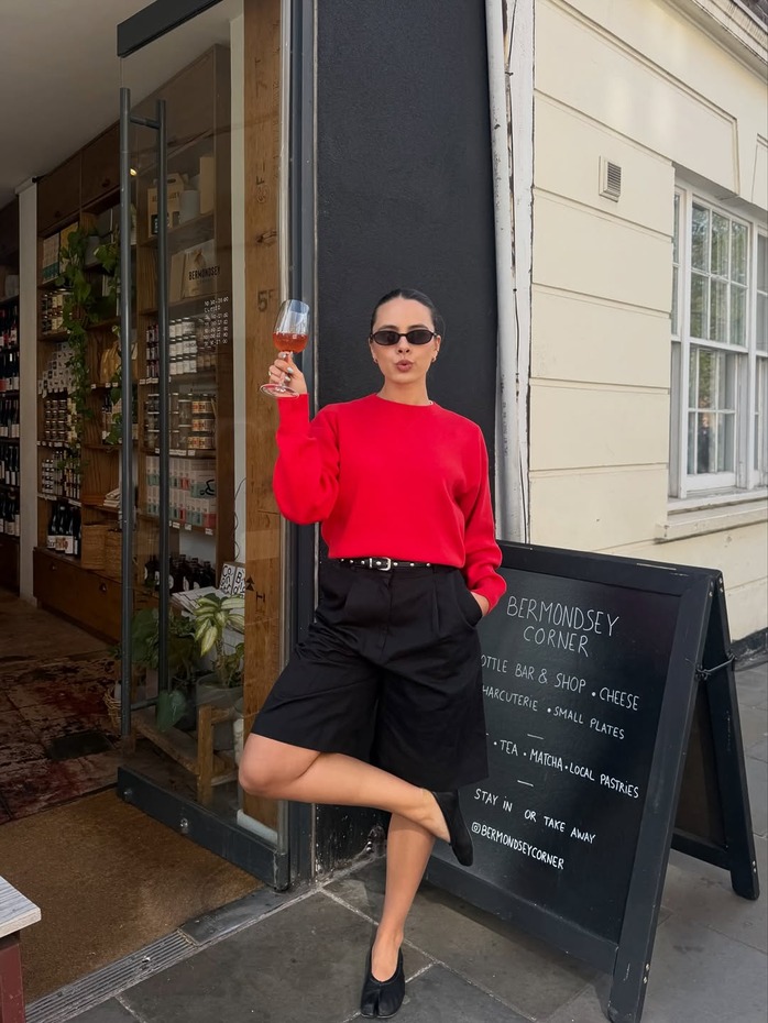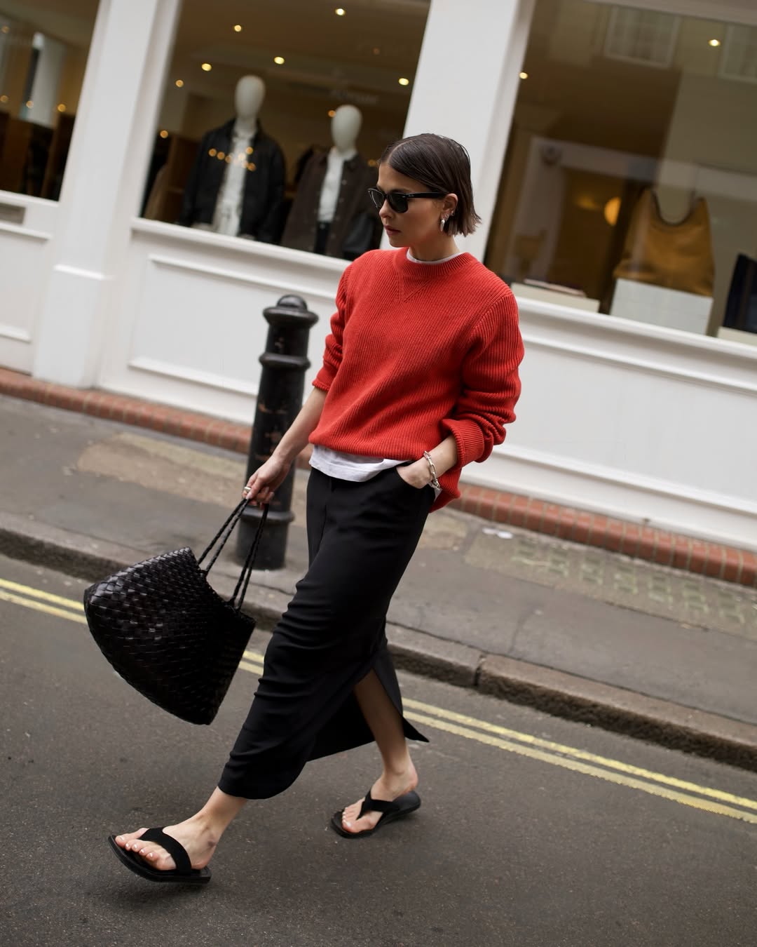 함께 매치하는 하의에 따라 무드가 극적으로 바뀌는 것 또한 매력적입니다. 지지 하디드처럼 청바지와의 조합은 말할 것도 없지만, 올봄엔 좀 더 대담해져도 좋아요. 배기 팬츠나 무릎을 덮는 박시한 버뮤다 팬츠처럼 조금은 투박한 실루엣의 하의를 입어보는 거예요. 레드 니트는 이런 하의와 만나면 룩을 단숨에 날렵하게 조이는 포인트가 되고, 반대로 포멀한 슬랙스나 미니멀한 롱스커트와 만나면 룩에 상큼한 위트를 더하죠.