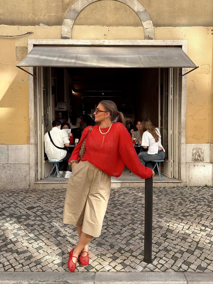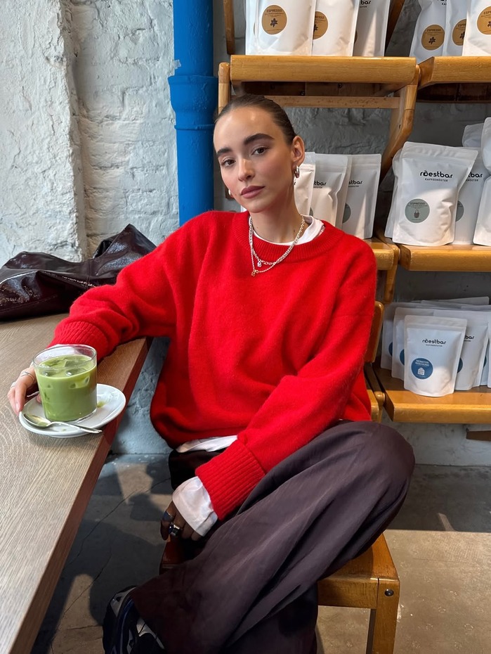 레드 니트의 진가는 레이어드할 때 제대로 드러나요. 무심하게 흰 티셔츠나 바스락거리는 셔츠에 걸치는 것만으로도 지루했던 기본템이 생동감을 얻게 되죠. 소매 끝으로 살짝 빠져나온 셔츠 소매나, 네크라인 위로 빼꼼히 고개를 내민 화이트 티셔츠의 한 끗. 이건 몽환적인 파스텔 톤이 결코 흉내 낼 수 없는, 레드가 가진 독보적인 힘이에요.
