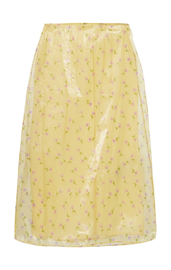 얇은 블랙 니트에 잔잔한 플라워 스커트를 매치하고, 발끝은 플랫 슈즈로 눌렀습니다. 페미닌한 아이템을 미니멀하게 풀어낸 거죠. 레이스와 러플이 쏟아지는 요즘 같은 때 이렇게 깔끔한 라인으로 패턴을 더하는 방식이 더 시크해 보이는군요.
