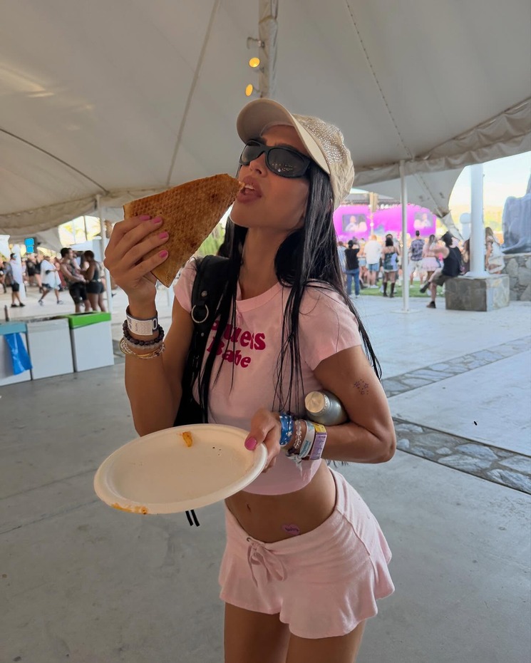 브랜드 로드 부스 운영과 남편 저스틴 비버의 공연을 위해 코첼라를 찾은 헤일리 비버. 그녀는 아이스크림처럼 달콤한 컬러의 슬립 드레스를 선택했습니다. 옐로와 마젠타 핑크가 은은하게 섞인 드레스는 건조한 사막 풍경 속에서도 상큼한 존재감을 드러냈죠.
