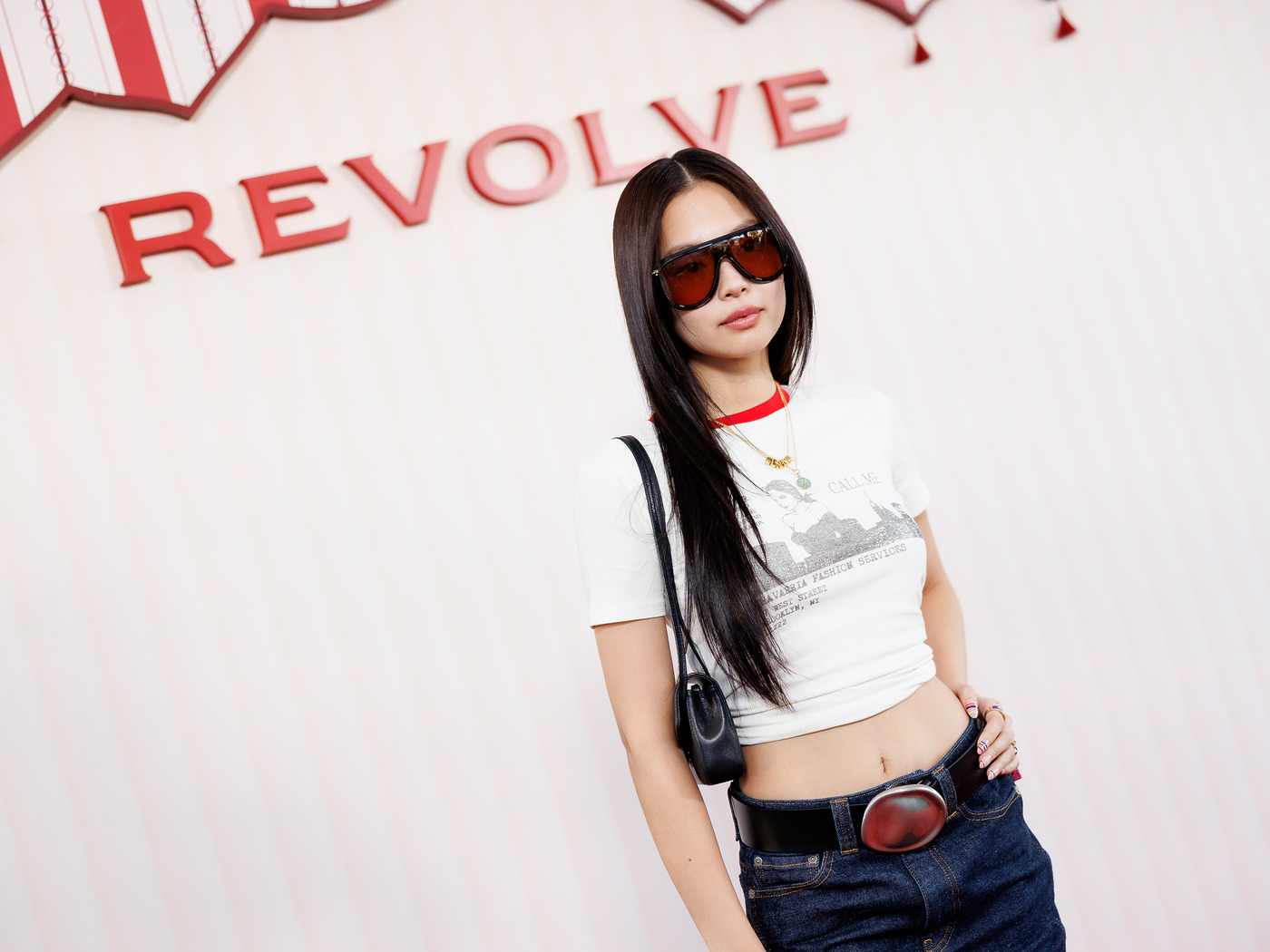 아멜리아 그레이는 핑크 셋업으로 시선을 사로잡았습니다. 크롭트 톱과 짧은 프릴 팬츠로 과감하게 실루엣을 드러내고, 가슴과 힙라인의 레터링으로 위트를 더했죠. 스터드 장식 백과 컬러풀한 레이어드 팔찌로 젠지 특유의 에너지를 강조했습니다.
