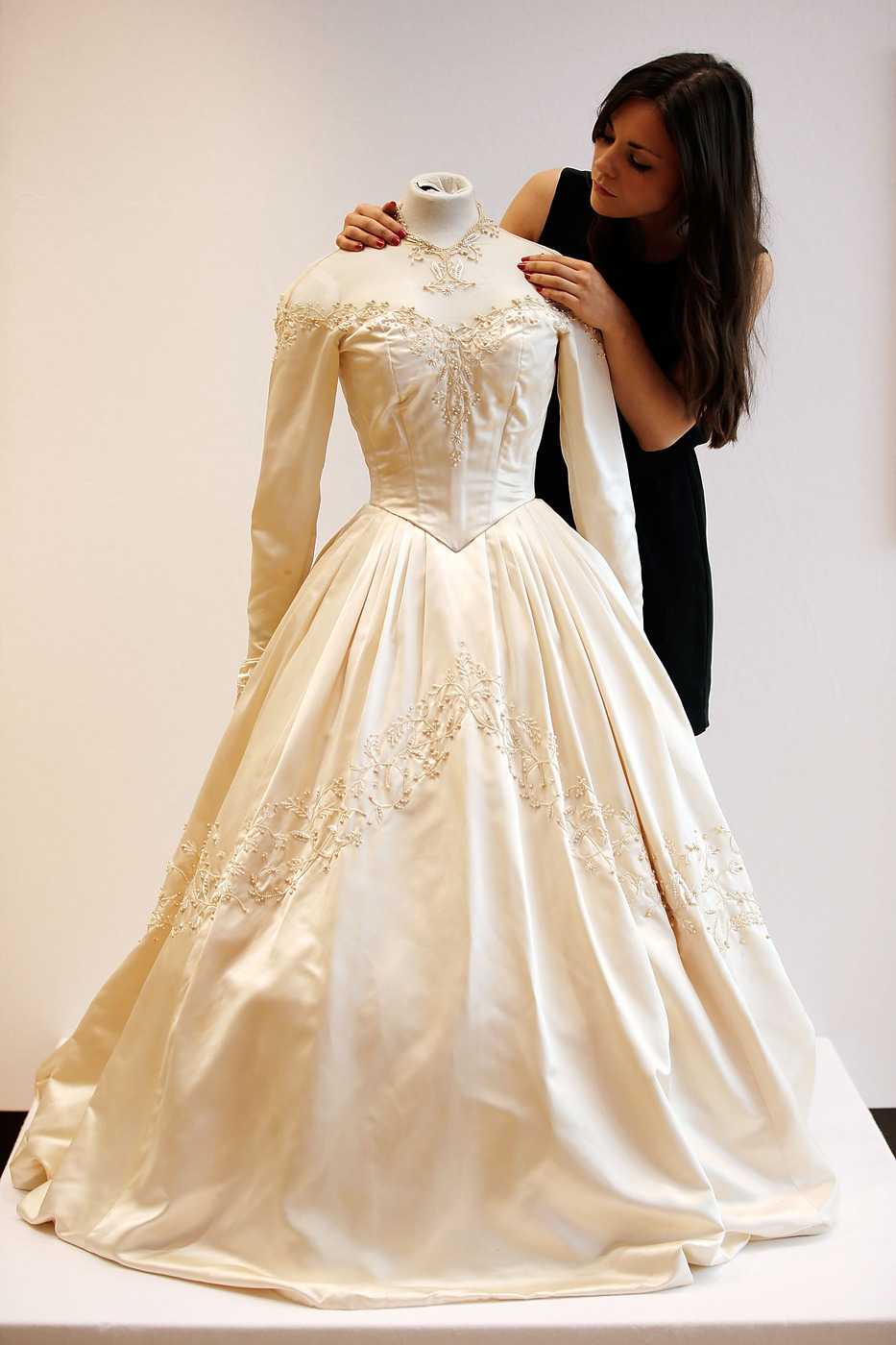 생전 여러 번 결혼식을 올렸던 엘리자베스 테일러는 콘래드 니키 힐튼 주니어와 생애 첫 결혼식을 올릴 때 헬렌 로즈(Helen Rose)가 디자인한 실크 오프숄더 드레스를 입었습니다. 시스루 레이스 칼라, 긴소매, 허리를 강조하는 코르셋, 수작업으로 진주 수백 개를 달아 무지갯빛이 은은하게 감도는 것이 특징입니다. 엘리자베스 테일러는 진주가 박힌 티아라에 실크 튤 소재 긴 베일로 화려함을 더했습니다.
