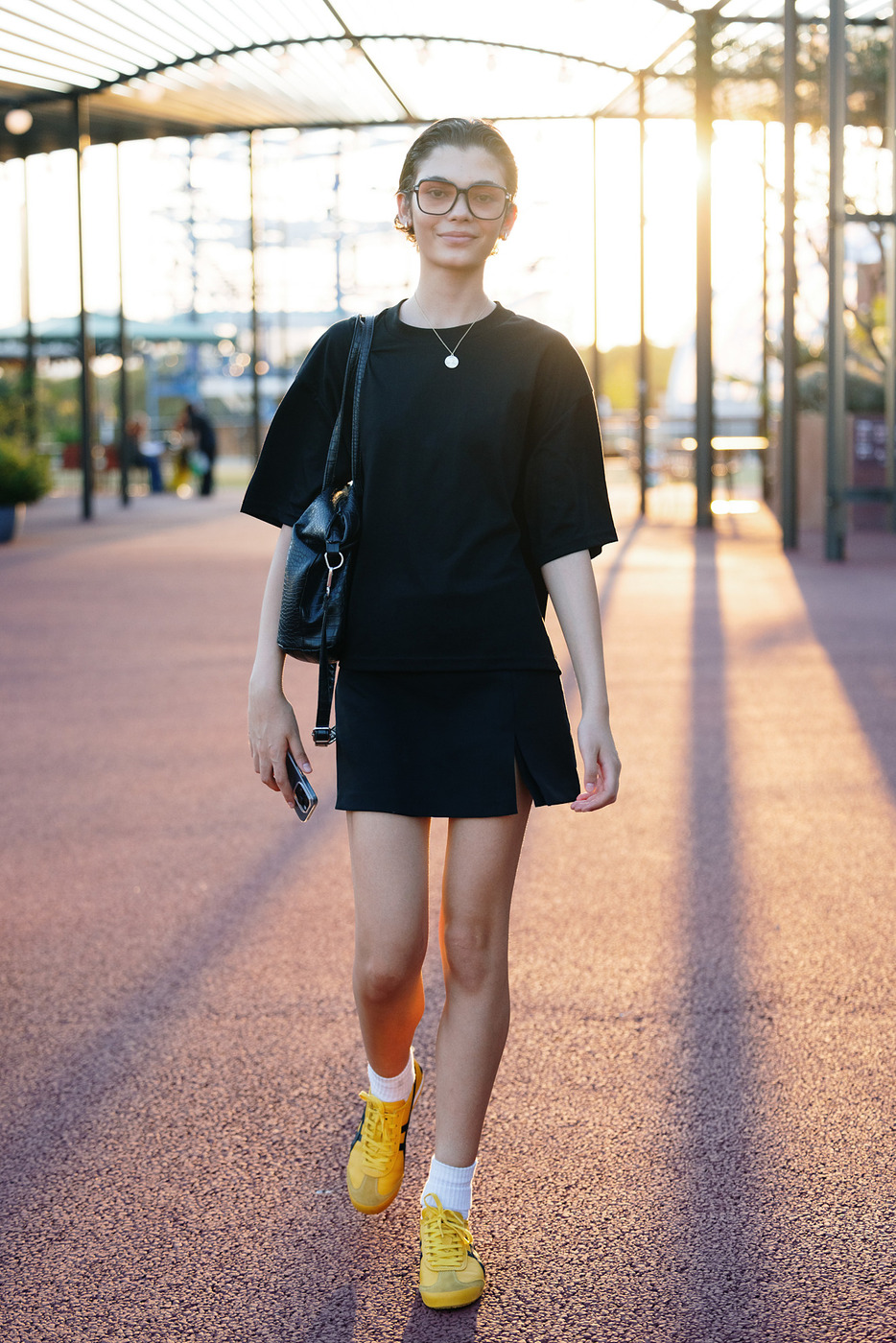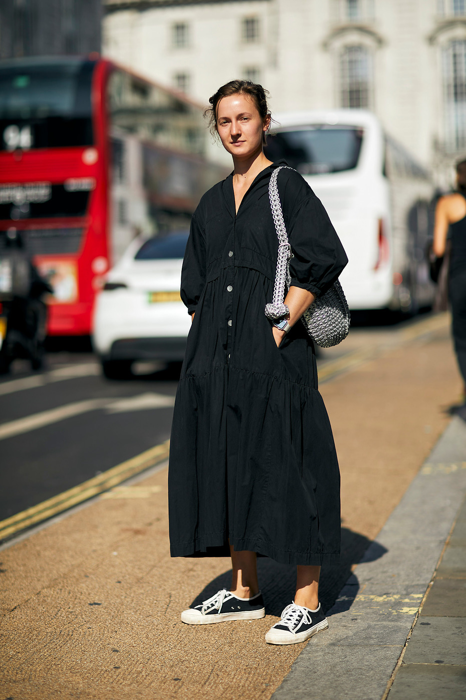 여유로운 핏 덕분에 여름에도 입기 좋은 롱 블랙 드레스는 어떨까요? 가장 추천하고 싶은 것은 캔버스 소재의 검정 스니커즈입니다. 화려한 컬러나 볼드한 실루엣의 스니커즈를 신으면 자칫 시선이 발 쪽으로만 쏠릴 수 있기 때문이죠. 룩이 심심해 보이는 걸 방지하기 위해 백이나 주얼리 등 액세서리에 신경 쓰는 것도 잊어서는 안 되겠습니다.