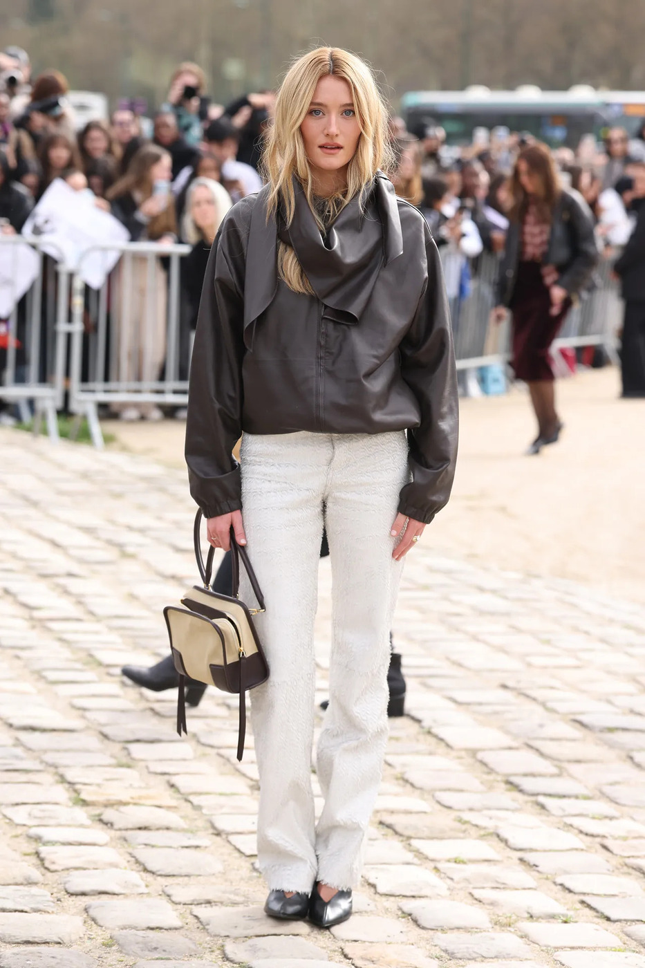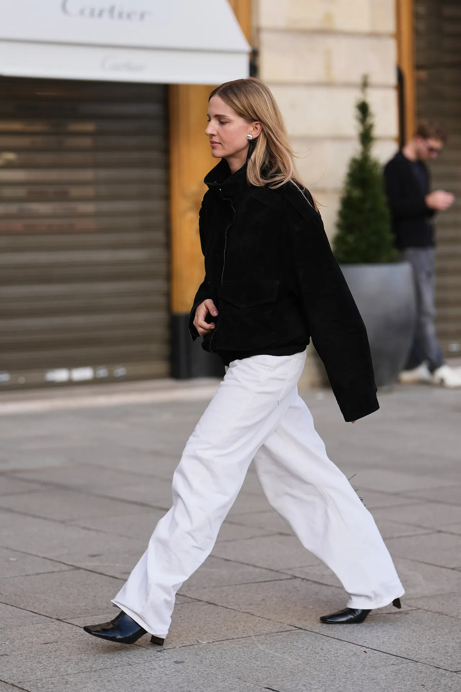 미색이 조금 섞인 화이트로 방향을 틀어보세요. 스타일링이 훨씬 쉬워집니다. 특히 브라운 아이템이 많다면 더욱 요긴하죠. 브라운 레더 재킷에 화이트 진으로 건조한 멋을 내보세요. 레더와 데님이 강력한 존재감을 뽐내니, 신발은 힘을 뺀 플랫 슈즈면 충분합니다.