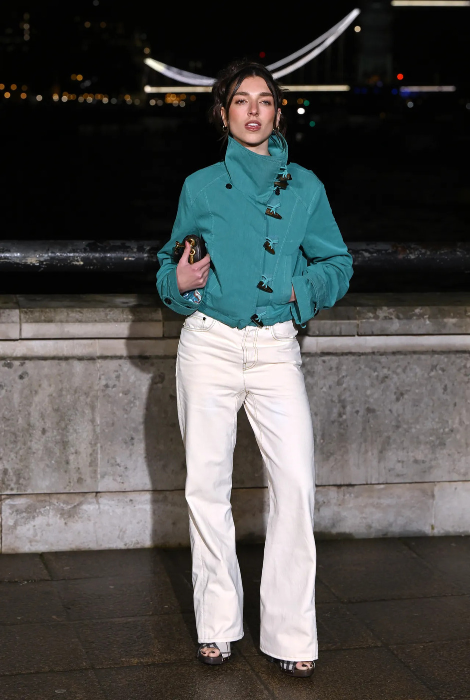 컬러 재킷 + 화이트 진 + 오픈 토 펌프스