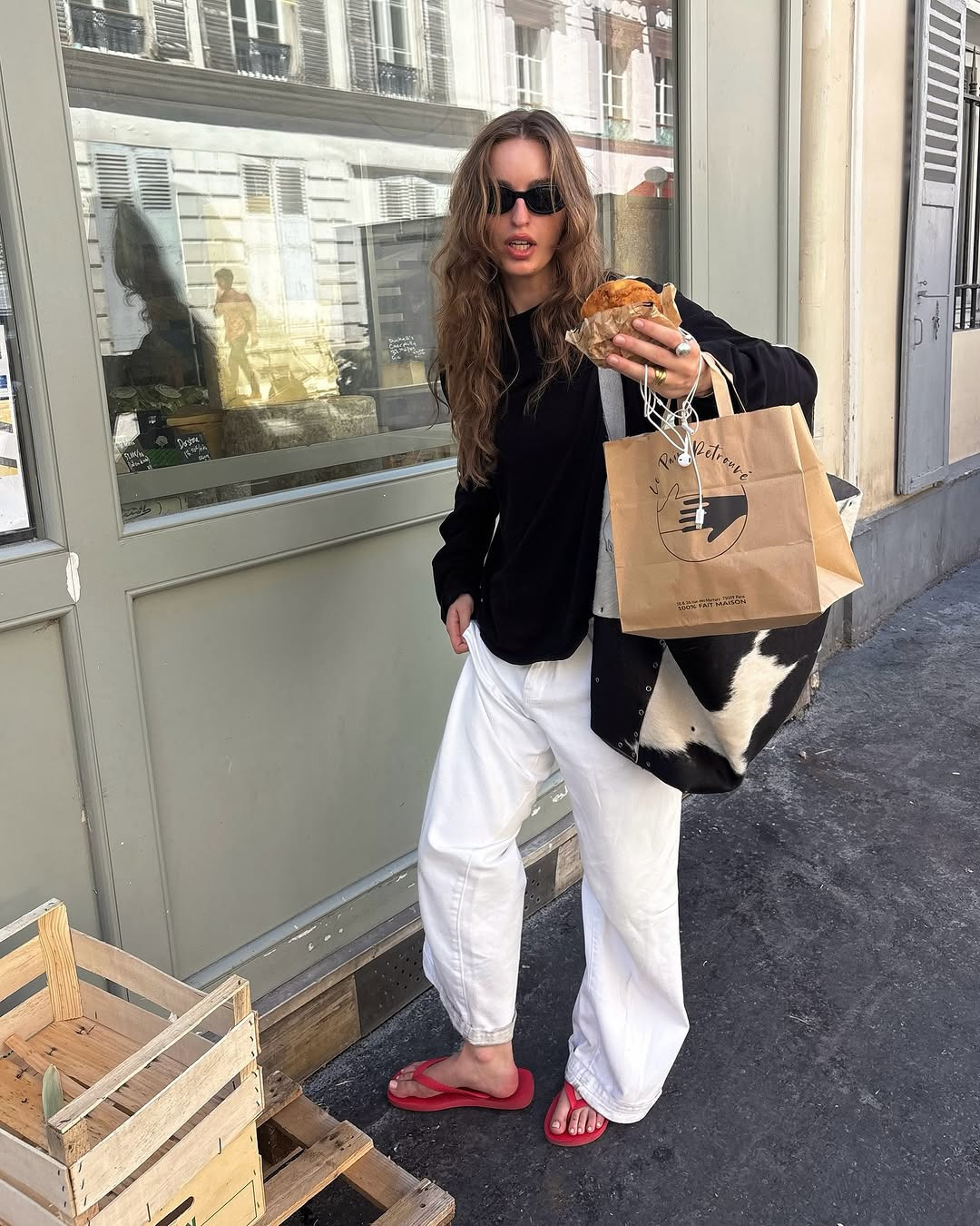 화이트 티셔츠 + 화이트 진 + 스트랩 샌들
