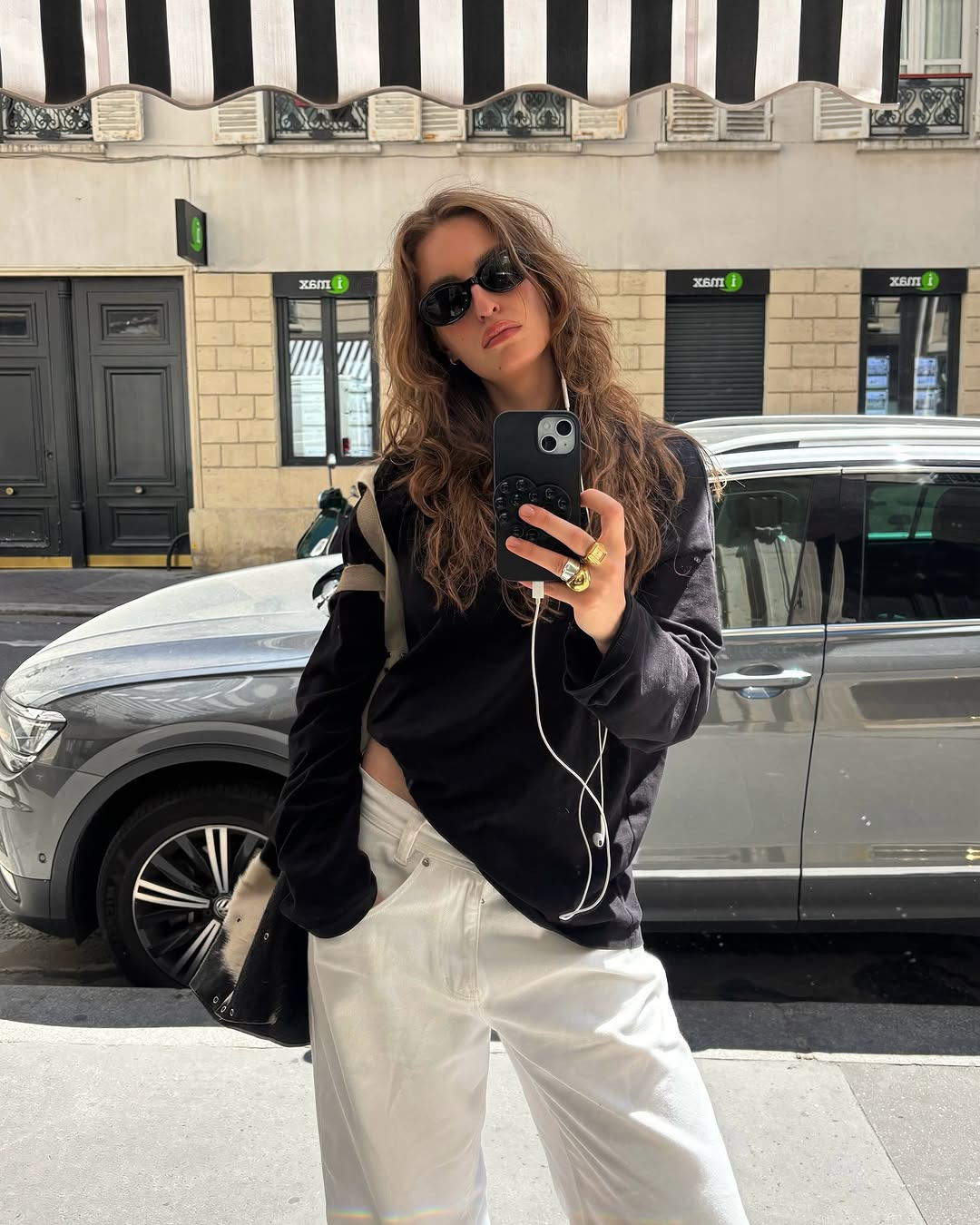익숙한 실루엣입니다. 편안하게 뚝 떨어지는 와이드 진에 앵클 부츠로 긴장감을 불어넣어주세요. 이때 와이드 진을 화이트로 바꾸면 담백한 멋이 배가됩니다. 늘 입던 블랙 봄버 재킷이 블랙 진과 입었을 때보다 더 또렷해 보이는 이유죠. 실버 이어링까지 더하면 심플하되 심심하지 않은 룩이 완성됩니다.