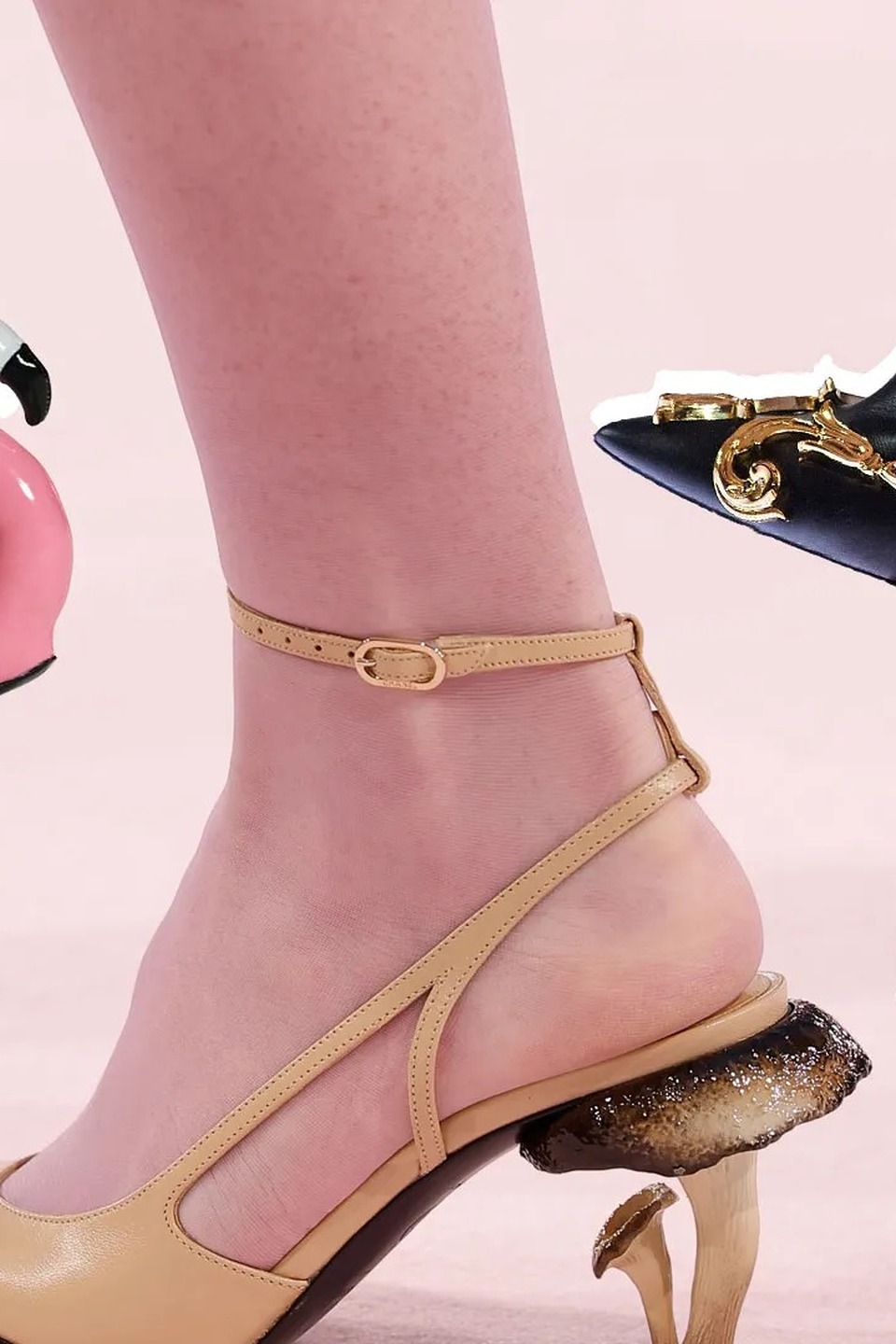 동화 속에서 툭 튀어나온 듯한 하이힐은 그다지 낯선 아이템은 아닙니다. 트롱프뢰유(착시)는 패션 업계에서 전통과 다름없죠. 니콜라 제스키에르가 선보인 발렌시아가 2007 봄/여름 컬렉션의 레고 힐, 알렉산더 맥퀸의 2010 봄/여름 아르마딜로 플랫폼 슈즈, 와이/프로젝트가 재해석한 신데렐라 슬리퍼는 여전히 회자되는 아이템이죠. 최근 꾸뛰르도 마찬가지입니다. 스키아파렐리는 공작새 부리 모양 펌프스를 런웨이 위로 올렸고, 마티유 블라지는 대지의 기운을 담은 버섯 모양 스틸레토를 선보였죠.