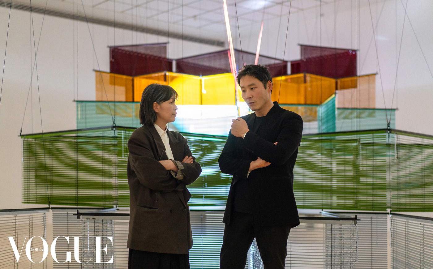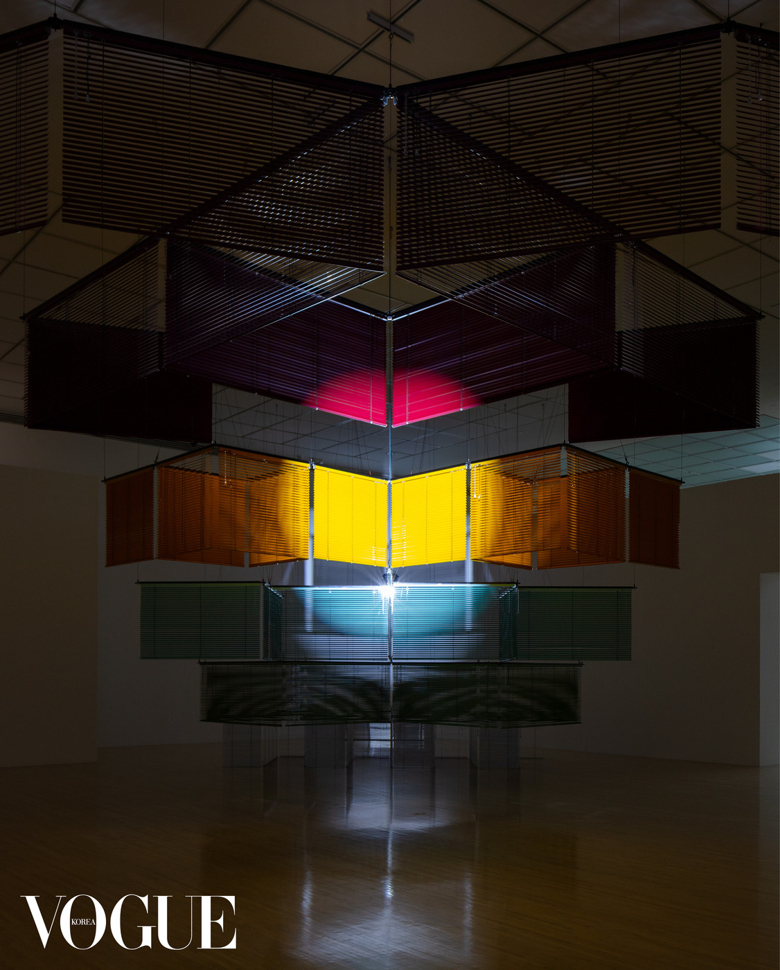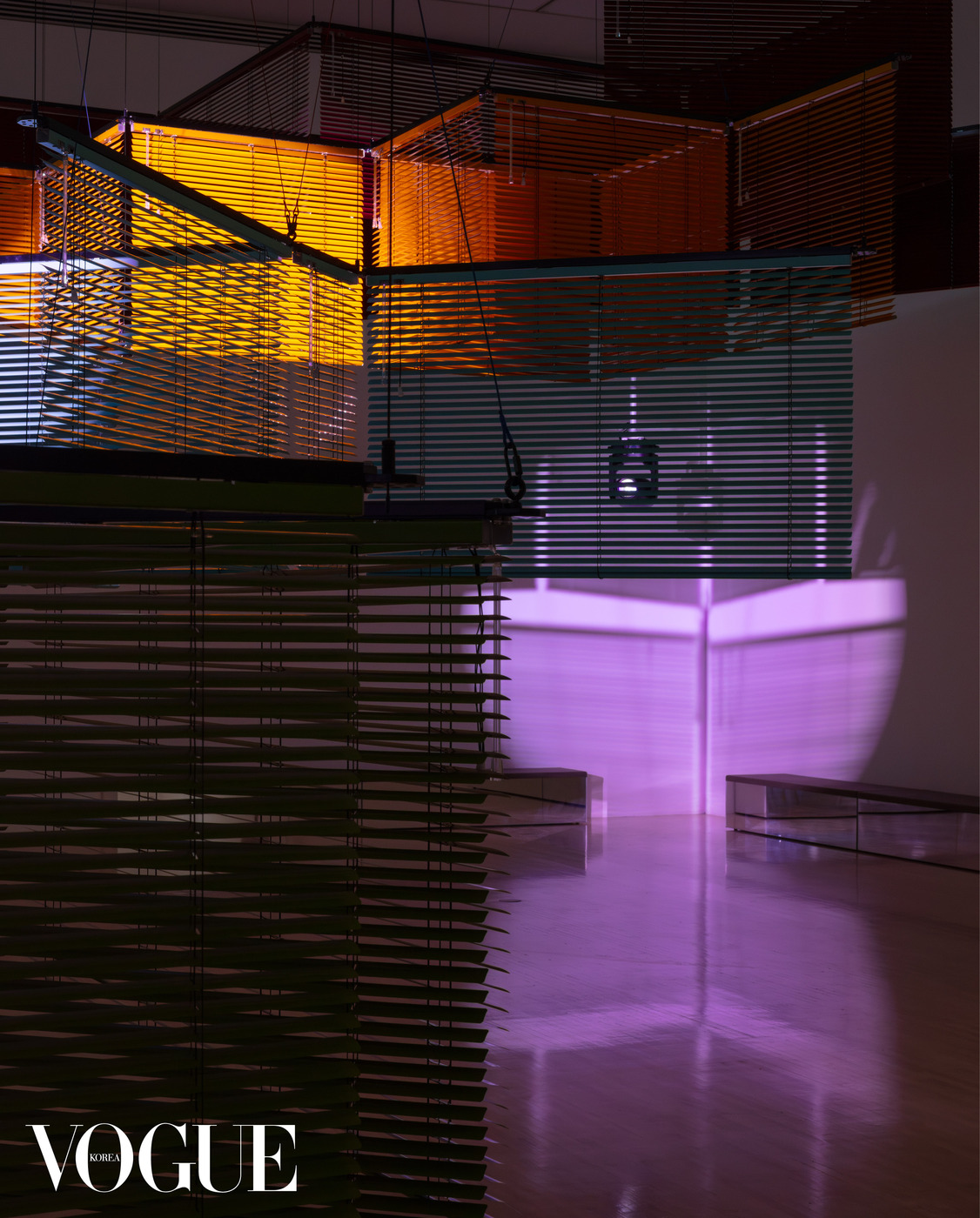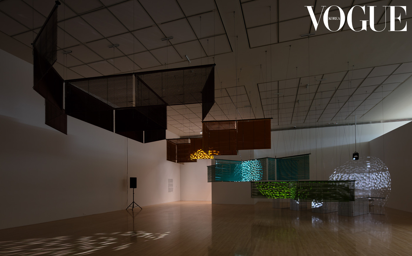 ‘윤에 따른 엇갈린 랑데부’는 각기 다른 색상과 구조의 블라인드가 다채로운 층위를 구성하며 상승하는 사선의 형태를 띠고 있다. 조각으로서는 흔치 않게 러닝타임을 갖는데, 대략 1시간 반을 훌쩍 넘어선다. 보통 협주곡은 하나의 독주 악기가 이끄는 반면, ‘이중 협주곡’은 오보에와 하프가 선율을 주고받으며 곡을 구성한다. 윤이상의 동료이자 실제 부부였던 오보에 연주자 하인츠 홀리거(Heinz Holliger)와 하프 연주자 우르술라 홀리거(Ursula Holliger)가 연주한 1985년 버전의 곡이 35분 40초간 흘러나온 후 그보다 긴 소강상태가 이어진다. 이에 맞춰 조명도 동기화된다. 개별적인 몸처럼 고요히 깜빡이며 스치던 두 개의 조명은, 음악과 함께 유기적으로 교차하고 뒤섞이며 강렬한 빛의 향연을 선보인다. 조명과 음악이 격하게 만날 때와 그렇지 않을 때, 신기하게도 블라인드의 겹침과 그러데이션마저 다르게 감각된다. ‘이중 협주곡’ 자체의 대칭적인 구조부터 윤이상이 평생 간직한 통렬한 그리움의 정서까지 총체적으로 겹겹이 쌓인 블라인드 안팎으로 펼쳐지는 여정. 진지하게 자리를 지키던 목격자들 사이에서 낮은 탄성과 박수가 터져 나오기도 했다.