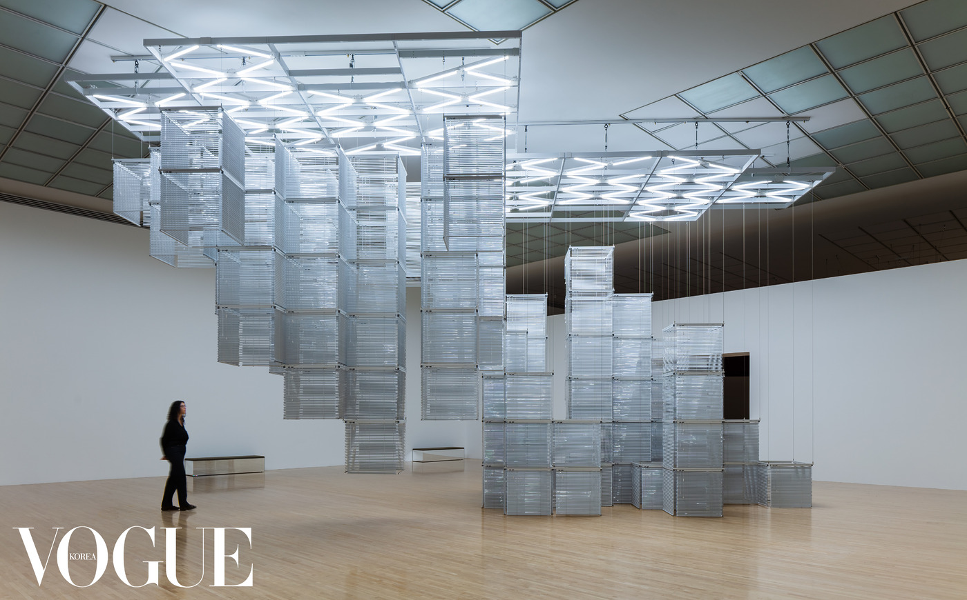 ‘윤에 따른 엇갈린 랑데부’ 옆 전시장에 또 다른 블라인드 작품 ‘솔 르윗 뒤집기–1078배로 확장·복제하여 다시 돌려 놓은 K123456(Sol LeWitt Upside Down–K123456, Expanded 1078 Times, Doubled and Mirrored)’(2015, ‘솔 르윗 뒤집기’)을 놓아 대구를 이루게 한 건, 쌍의 의미와 비대칭성의 효과를 극대화하고자 한 전략이다. 전자가 반쪽의 구조라면, 후자는 쌍의 구조다. 일단 생김새부터 다르다. ‘윤에 따른 엇갈린 랑데부’가 상승과 하강의 뚜렷한 대조와 움직이는 조명으로 드라마틱한 서사를 시사한다면, 고정된 조명 아래 두 군데의 접합점을 만드는 ‘솔 르윗 뒤집기’는 하늘에서 뚝 떨어졌거나 땅에서 불쑥 솟은 듯 엄격하다. 이 역시 작품 안에 어떤 인물이 ‘배양(Incubate)된’ 상태인데, 솔 르윗(Sol LeWitt)은 미국의 미니멀리스트이자 미술관 소장품전에서 볼 법한 개념 미술의 거장이다. 양혜규는 그의 상징적인 정육면체 구조물을 재해석했다. 원작 스케일을 1,078배로 확대하고 데칼코마니처럼 반사해 거꾸로 거는 방식으로 모듈식 설치작을 만든 것이다. 솔 르윗의 정육면체는 전면이 열려 있지만, 양혜규는 이를 흰색 블라인드로 채워버렸다. 어디서 보느냐에 따라 블라인드가 겹쳐지는 정도와 밀도가 달라지는데, 블라인드 작품의 큰 특징이었던 투과성은 희미해지고 대신 불투명성과 투명성 간에 새로운 관계가 생겨난다.