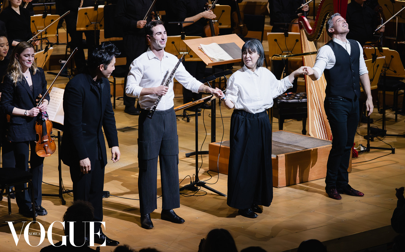 오케스트라의 비호 아래 만남과 헤어짐을 반복하는 오보에와 하프의 존재감은 특히 시각적, 공간적 연출로 확연히 두드러졌다. 실제 윤이상은 악보에 ‘멀리서’ ‘아주 가까이서’ 등의 지시어를 적어 넣으며 소리의 거리와 움직임을 곡의 일부로 녹여냈고, 이얼은 이런 공간적인 제스처를 공연에 적극 반영했다. “보통 공연에서는 독주자들이 무대 앞에서 연주를 시작하는데, 이번에는 다르게 접근했어요. 곡 중간에 오보에와 하프가 만나는 부분이 있어요. 그때 맨 뒤에서 연주하던 오보이스트와 하피스트가 걸어와 중앙에서 만나면 어떨까 한 거죠. 시각적인 측면을 고려한 건데, 음악적으로도 충분히 의미가 있다고 봐요. 초반에 특히 그리움 같은 요소, 하나가 되고자 하는 열망과 긴장감 등을 무대 위의 움직임으로 표현하는 것이요. 공연에서 이런 유연성을 발휘하기가 쉽지 않지만, 이번에는 모두 기꺼이, 흔쾌히 수용했어요. 하피스트는 하프를 두 대나 준비해주었고, 그래서 두 사람이, 두 악기가 실제로 분리되었다 만나는 구성이 가능해진 겁니다.”