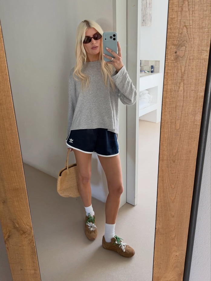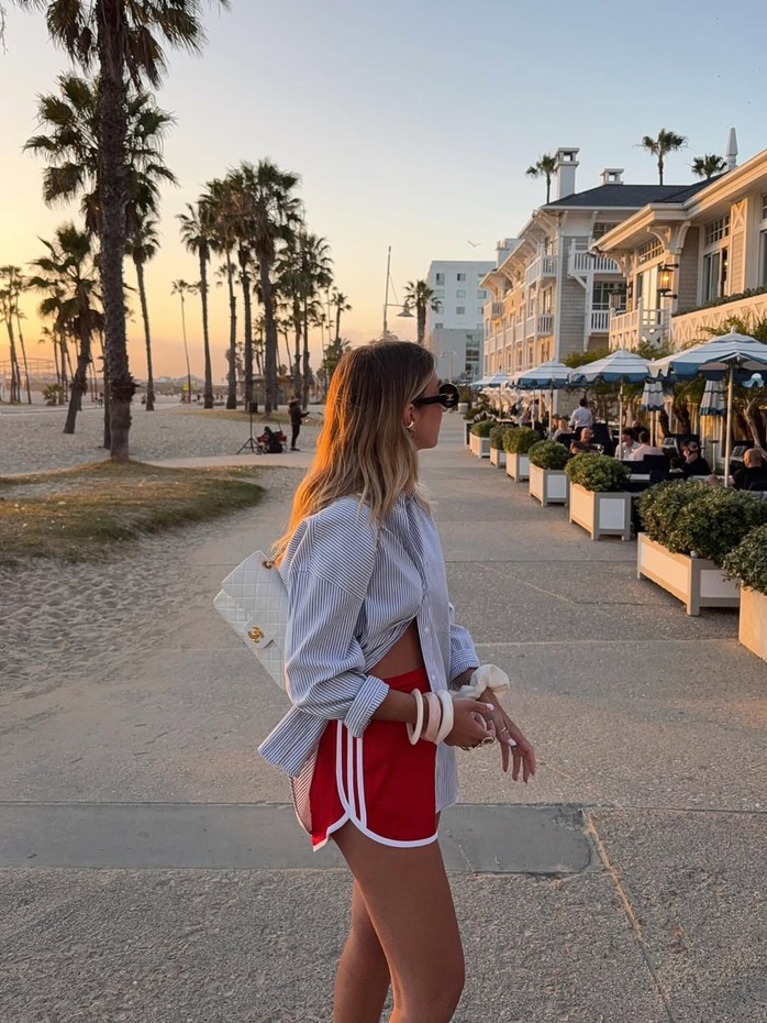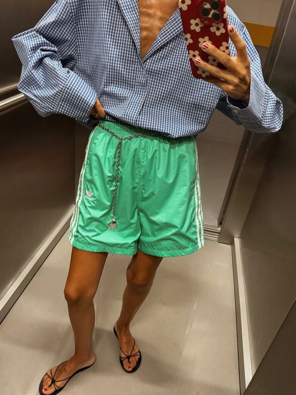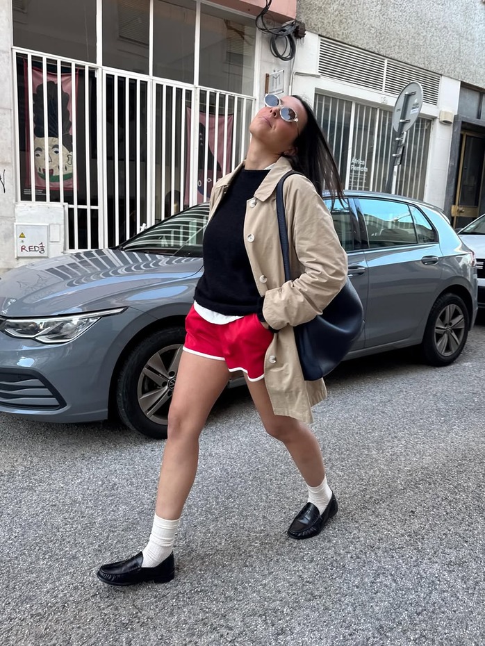 이런 분위기는 트랙 쇼츠에서도 그대로 이어집니다. 길이만 짧아졌을 뿐 일상에서 즐기는 편안한 무드는 긴바지랑 똑같거든요. 특히 컬러 플레이에도 유용한데요. 빨간 쇼츠에 로퍼와 흰 양말을 신고, 봄 코트를 매치하면 프레피 무드를 위트 있게 비틀 수 있죠. 또 얇고 바스락거리는 박시한 셔츠와 함께하면(단추는 마음껏 풀어도 좋아요!) 나른하면서도 쿨한 캘리포니아 감성을 연출할 수 있습니다.