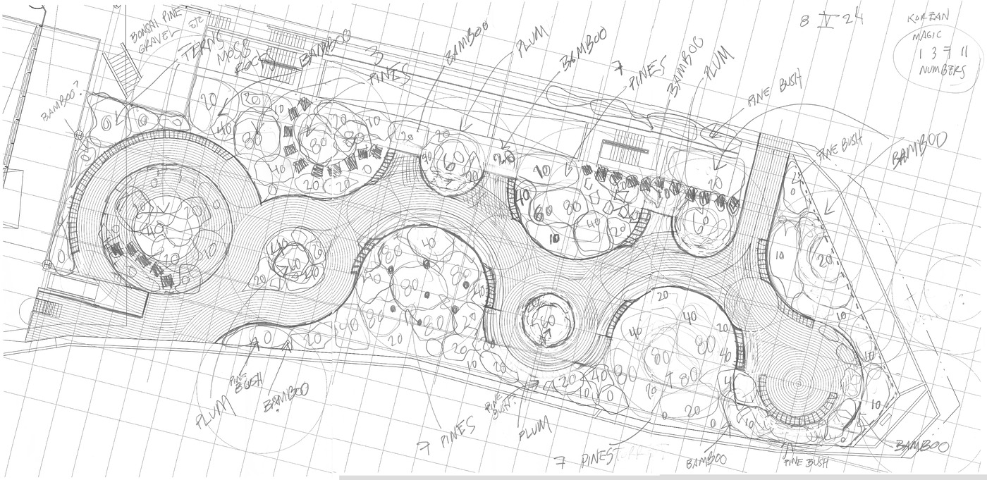 가브리엘 오로즈코는 지난 10여 년 동안 다양한 곳에서 ‘정원’ 프로젝트를 진행해왔습니다. 이번 리움 작업은 그 세 번째이자 가장 종합적인 버전인 셈이죠. 2016년 사우스런던 갤러리에서는 방치된 부지를 교차하는 원형 패턴의 영구 정원으로 변환한 정원을 만들었고요. 2019년부터 6년간 무려 242만여 평에 달하는 멕시코시티 차풀테펙 공원의 환경적, 문화적 마스터플랜의 설계와 총괄을 맡아 도시 규모의 공공 조각을 완성했는데요. 이번 리움 ‘정원’ 작업에는 동아시아의 전통 정신이 본격적으로 차용되고 있습니다. 작가는 ‘세한삼우(歲寒三友, Three Friends of Winter)’의 개념을 바탕으로, 가장 혹독한 계절인 겨울에 절제된 방식으로 정원을 지탱하는 나무들을 식물학적 골격이자 작업 철학의 뼈대로 삼습니다. 소나무 15주, 대나무 1500주, 매화나무 11주를 심었고, 이 외에도 백당나무, 설유화, 찔레나무, 물매화 등 흰 꽃 중심의 식물들을 함께 식재해 ‘삼우(三友)’, 세 벗과 함께 어우러집니다.
