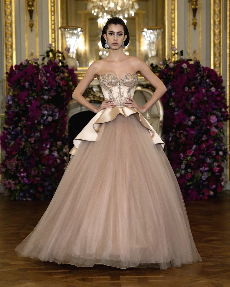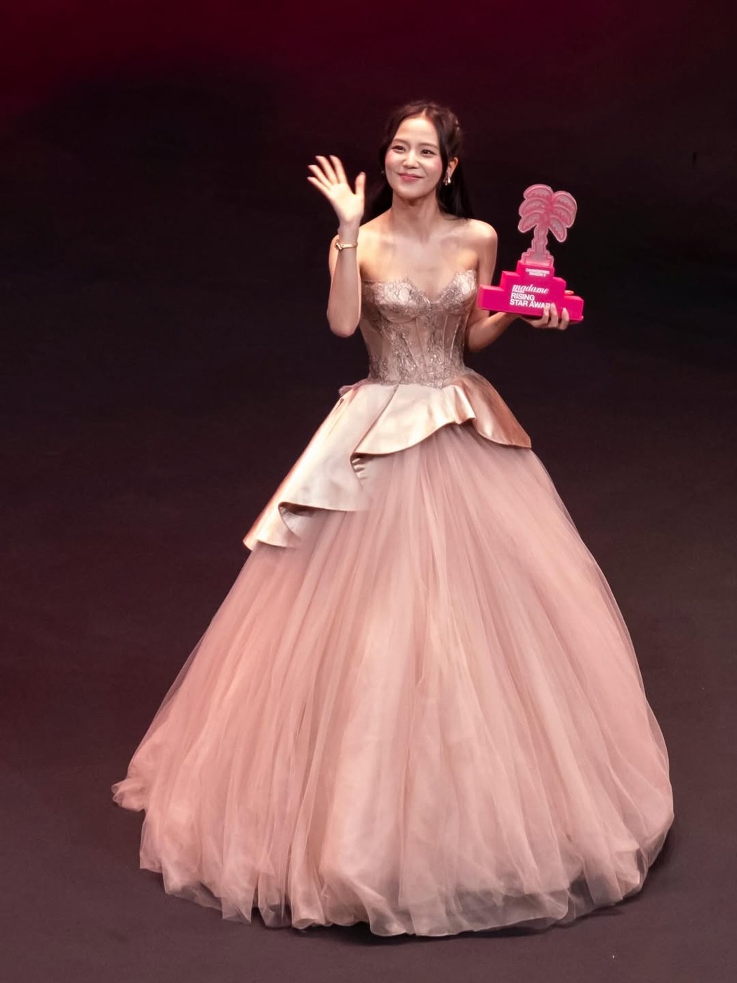 올해 처음 칸시리즈에 참석한 지수는 미소 소희의 2026 봄/여름 오뜨 꾸뛰르 컬렉션의 은은한 샴페인 핑크 드레스를 입고 핑크 카펫에 등장했습니다. 코르셋 형태의 톱 부분은 오프숄더에 화려한 비즈 장식으로 수놓았으며, 허리 아래로 튤 스커트가 풍성하게 퍼집니다. 허리 부분의 페플럼 디테일이 우아함을 더합니다.