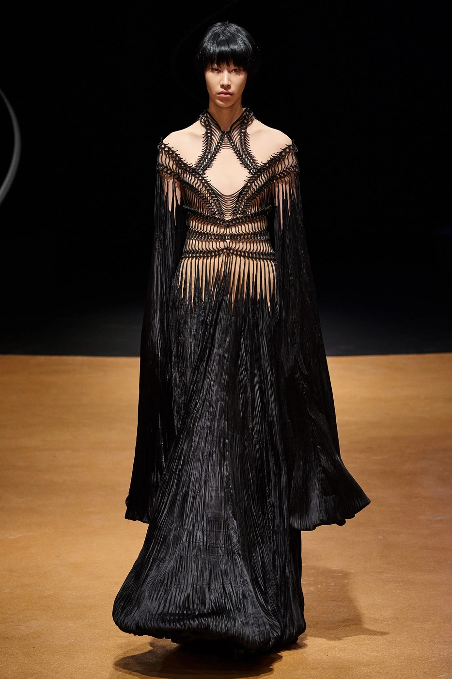 현지 시간으로 30일, 런던 프리미어 행사에 해서웨이는 확연히 어두운 분위기로 등장했습니다. 스타일리스트 에린 월시와 함께 선택한 의상은 아이리스 반 헤르펜의 2020 봄/여름 오뜨 꾸뛰르 컬렉션 드레스입니다. 2020년 1월 파리 패션쇼 오프닝을 장식한 룩으로, 레이저 커팅한 가죽 조각을 연결해 만든 하이넥 코르셋 톱 부분이 시선을 압도합니다. 길게 늘어지는 소매와 스커트에 풍성한 주름을 더해 전체적으로 드라마틱한 실루엣을 완성했습니다.