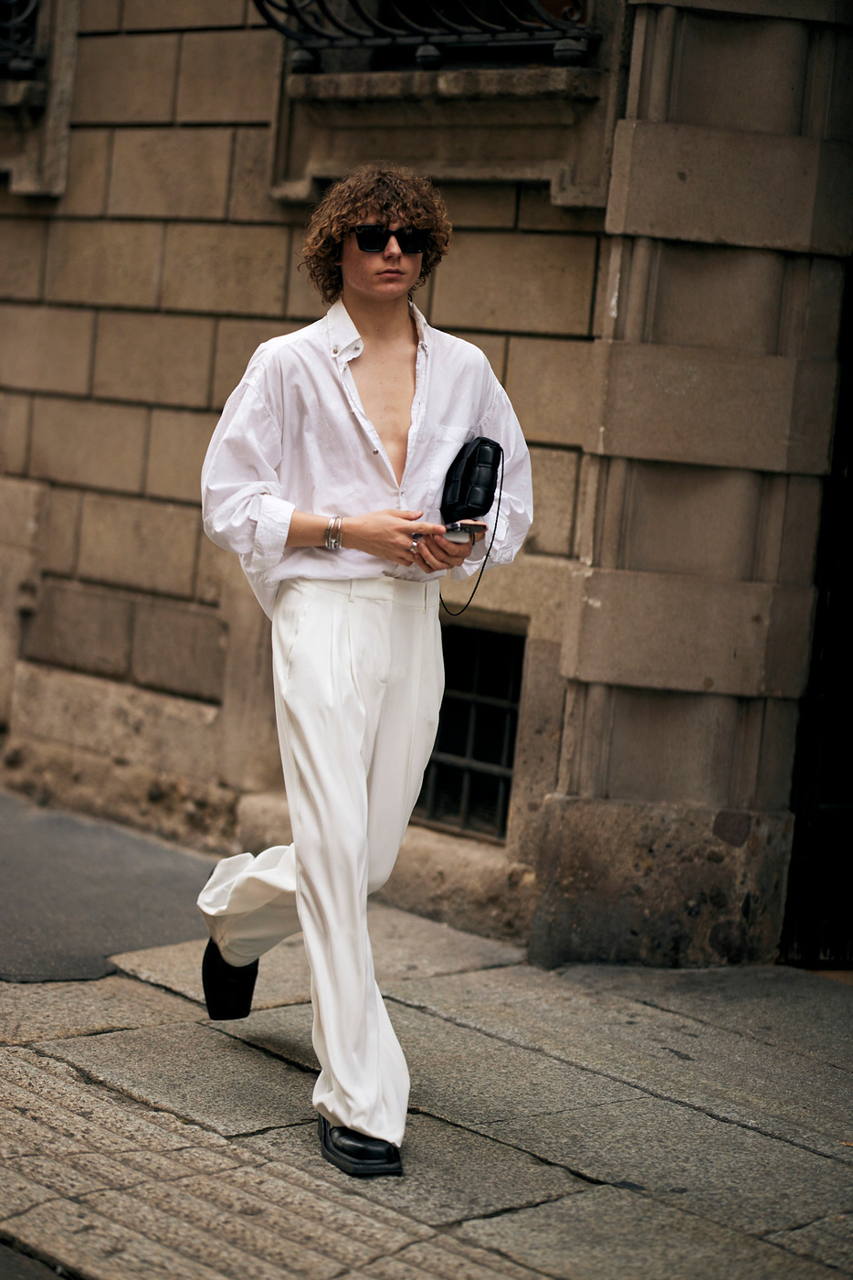 얇은 소재, 살짝 비쳐 보이는 다리 그리고 펄럭이는 핏까지. 여름철의 클래식, 팔라초 팬츠 이야기입니다. 원래도 산뜻한 분위기를 자아내는 아이템에 품이 낙낙한 흰 셔츠를 매치하면 더할 것도, 뺄 것도 없는 여름 룩이 구현되죠. 시스루 소재의 이너가 부담스럽다면, 흰 무지 티셔츠를 활용해도 좋습니다.