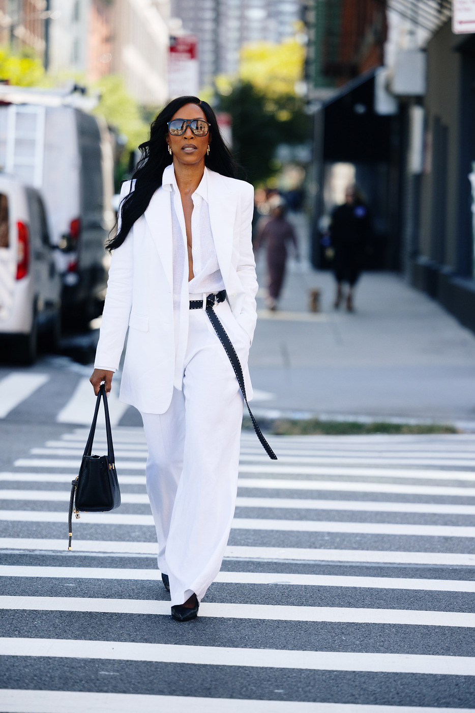 ‘올 화이트’라고 해서 모든 걸 흰색으로 통일할 필요는 없습니다. 적재적소에 검정색을 가마한다면, 세련미를 더하는 동시에 심심함까지 덜어낼 수 있죠. 중요한 것은 흰색 본연의 미니멀함을 해치지 않는 선에서 검정색을 섞는 겁니다. 구두나 부츠, 벨트 그리고 클래식한 디자인의 백을 활용한 사진 속 룩처럼 말이죠.