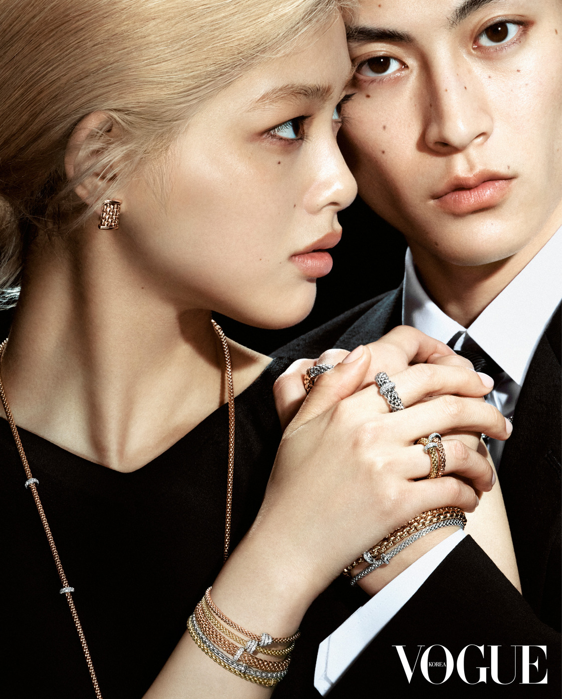 포페(FOPE)의 진수가 담긴 ‘에카’ ‘솔로’ ‘방돔’ ‘에센셜’ ’소울’ ‘파노라마’ ‘프리마’ ‘아리아’ 컬렉션 주얼리의 조화가 돋보인다. 히비키가 입은 재킷은 쿠르베(Courbe), 진이 입은 블랙 드레스는 자라(Zara).