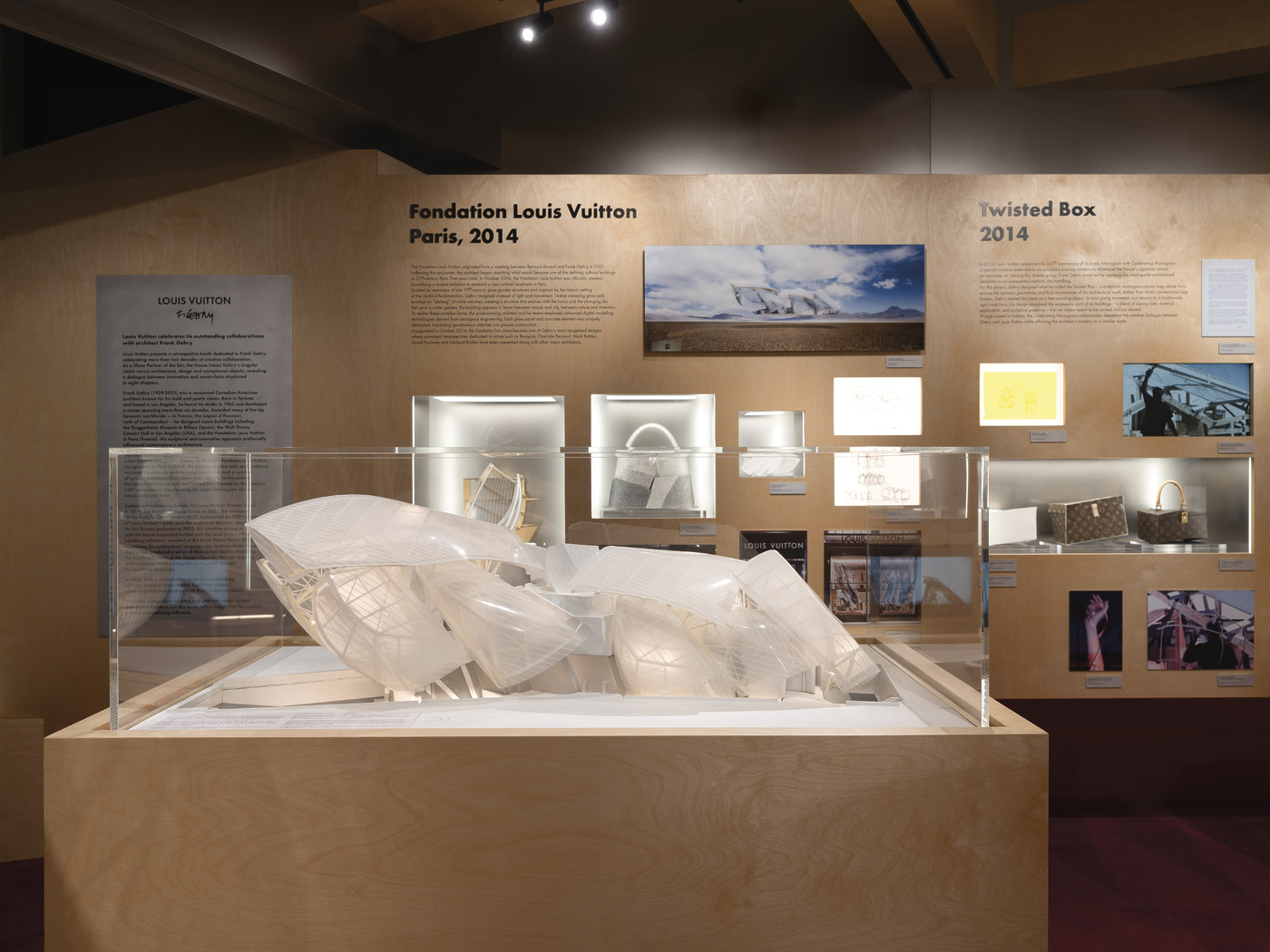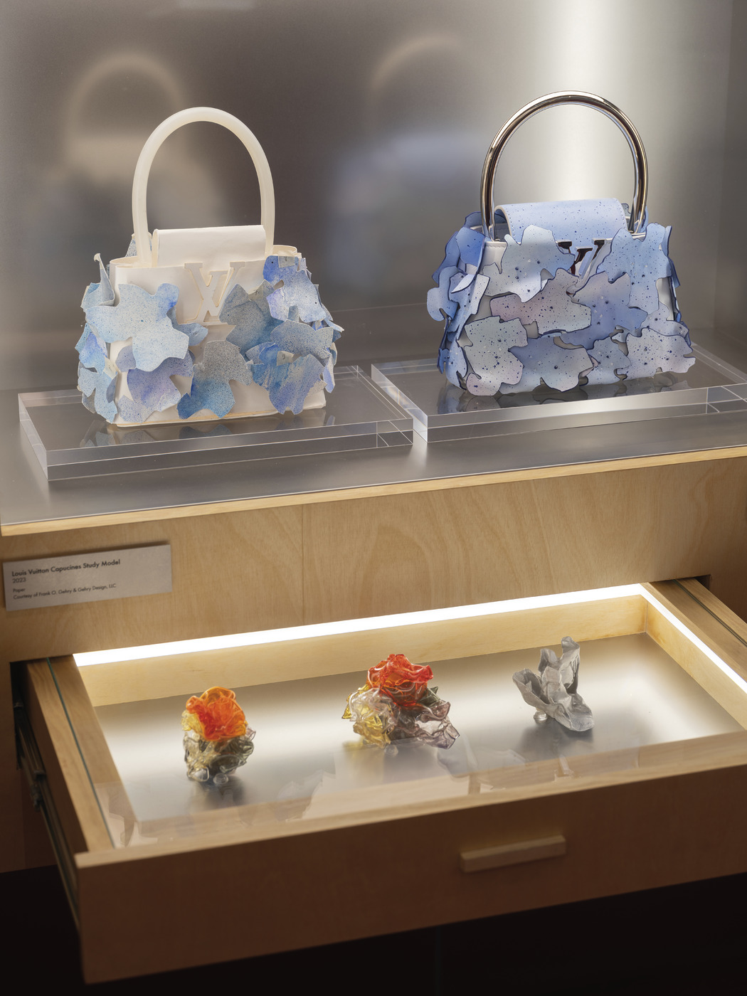 전시장 한쪽에 생전 인터뷰 영상이 고요히 흐르고 있었다. ‘레 젝스트레’ 향수를 위한 무라노 글라스 블라썸 스토퍼를 디자인할 당시 그는 미소 지으며 이렇게 말했다. “피아노 건반을 눌러보세요. 그 소리가 몇 초 동안 당신의 귀에 잔잔히 머물 거예요. 아름답지 않나요.” 향이 퍼지는 순간을 음악적 경험과 연동하며 무형의 에너지를 시적이면서도 조형적인 예술로 치환하고자 했던 접근법을 설명하고 있었다. 루이 비통과 프랭크 게리의 파트너십은 단순히 브랜드와 작가의 만남을 넘어선다. 2014년 루이 비통 재단 미술관 개관과 ‘트위스티드 박스’ 디자인으로 시작된 이들의 여정은 20여 년간 지속되며 패션과 건축의 경계를 허물어왔다. 게리는 루이 비통의 상징인 모노그램에도 각별한 관심을 가졌으며, 이를 뒤틀고 재해석해 하우스의 전통에 파격적인 생명력을 불어넣었다. 루이 비통 장인들은 게리의 복잡하고 비대칭적인 설계를 현실로 구현하기 위해 소재에 대한 노하우를 극한까지 끌어올렸고, 그 결과물은 하나하나가 ‘마스터피스’로서 예술적 가치를 인정받고 있다.