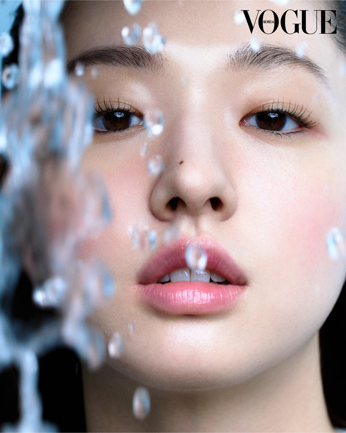 JUST ENOUGH 손끝에서 흘러내리는 물방울과 그 아래 깊이 있게 담긴 물. 이드라 뷰티 라인이 피부에 채운 수분 역시 넘치지 않고 필요한 만큼만 남아 번들거림 없이 차분한 윤기와 촉촉함을 남긴다. 그레이 니트 톱은 샤넬(Chanel), 팬츠는 나나 재클린(Nana Jacqueline).