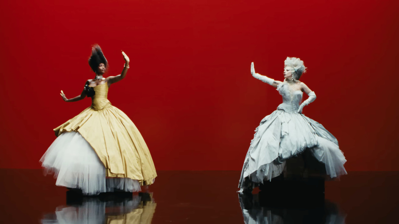 패리스 고블이 감독한 이번 뮤직비디오에서는 영화의 화려한 패션 콘셉트에 걸맞게, 각 아티스트가 돌아가며 다양한 의상을 선보입니다. 두 뮤지션은 초현실적인 공간에서 보석 장식 보디수트부터 풍성한 스커트의 볼가운까지, 아방가르드한 의상을 입고 카메라 앞에서 유쾌한 포즈를 취합니다(사실 다음 주에 열릴 2026 멧 갈라에서 이 의상들을 입고 나타나도 전혀 어색하지 않을 정도죠).