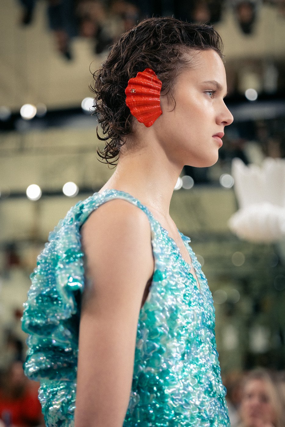 빛으로 가득한 방 안에서 게스트들은 1920년대풍 수영복, 수영 모자, 머메이드 드레스와 실크 스카프 드레스를 보며 미소를 지었다. 쇼는 그 외에도 볼거리가 넘쳤다. 비아리츠의 나무를 본뜬 격자무늬 레이스 장식 수트, 물고기의 비늘을 연상시키는 코트, 힐만 남은 샌들까지. 블라지는 프리뷰 자리에서 파란색 레진으로 만든 퀼팅 백을 자랑스럽게 꺼내 보이기도 했다. “방수 아이템이에요. 이 가방을 들고 수영도 할 수 있죠!”