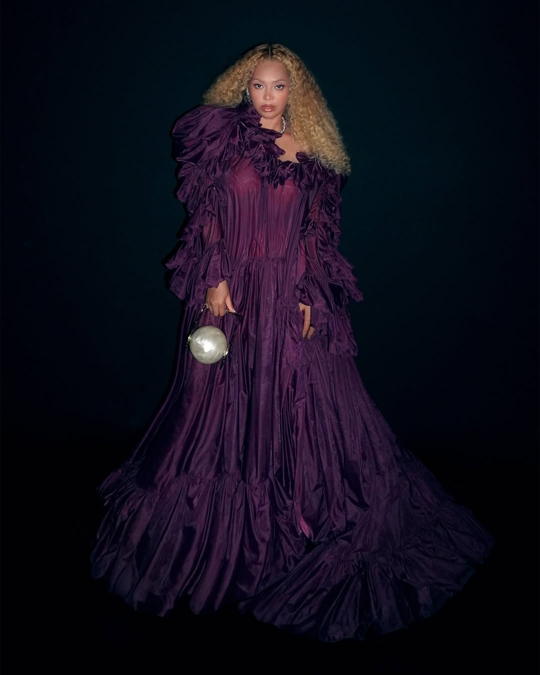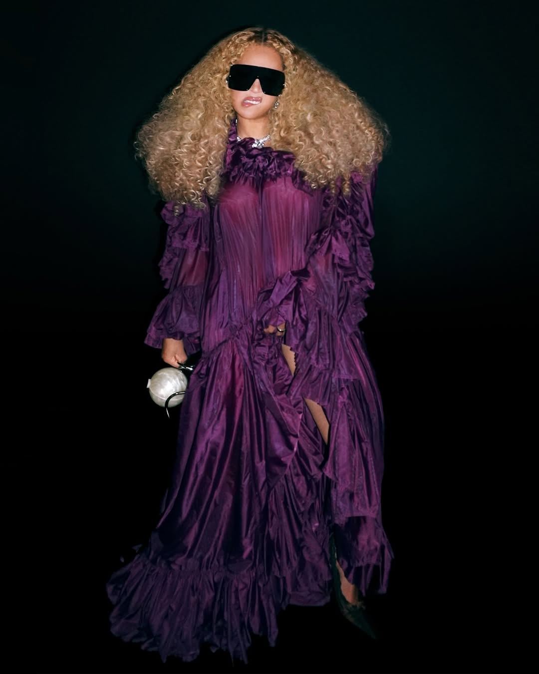 비욘세가 최근 인스타그램에 올린 사진 속 룩을 주목해보세요. 사진 속 그녀는 몽환적인 보라색과 볼륨감 넘치는 퍼프 소매, 화려한 러플 장식이 돋보이는 생 로랑 2026 봄/여름 컬렉션의 화려한 드레스를 입고 있습니다. 여기에 컬트 가이아의 진주 장식 가방과 검은색 선글라스, 그리고 다이아몬드와 진주가 박힌 초커로 스타일을 완성했습니다.