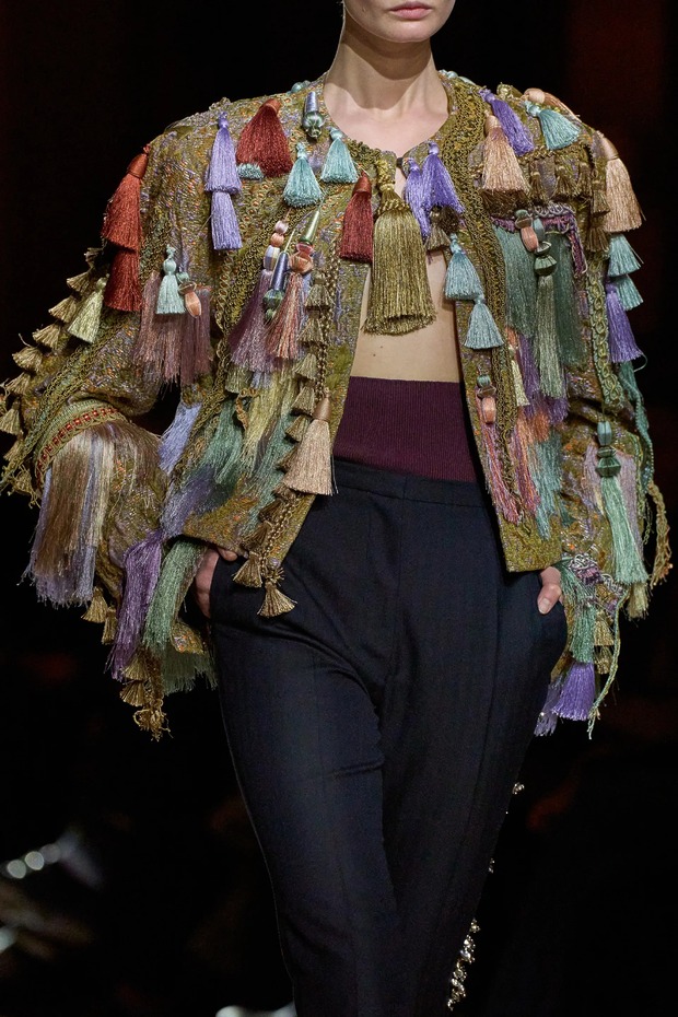 그는 미란다가 <런웨이> 경영진과 맞서는 장면에 이 멋진 재킷을 활용하거든요. 드리스 반 노튼의 새로운 크리에이티브 디렉터 줄리앙 클라우스너의 첫 컬렉션 의상으로, 분명 런웨이에서는 당당하고 존재감 넘치는 옷이었죠. 하지만 미란다가 걸음을 옮길 때마다, 혹은 누군가 강하게 그녀의 어깨를 잡을 때마다 태슬이 그녀의 마음처럼 후두두 흔들립니다. 우리가 사랑했던 20년 전 미란다에 감정 이입하기 딱 좋은 순간이죠. 그러니 영화를 보고 난 뒤 이 재킷이 기억에 남을 수밖에요.